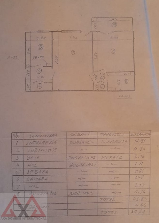 Compartimentarea este semidecomandata, avand o suprafata totala de 50,28mp, balcon pe dormitor si spatii de depozitare.