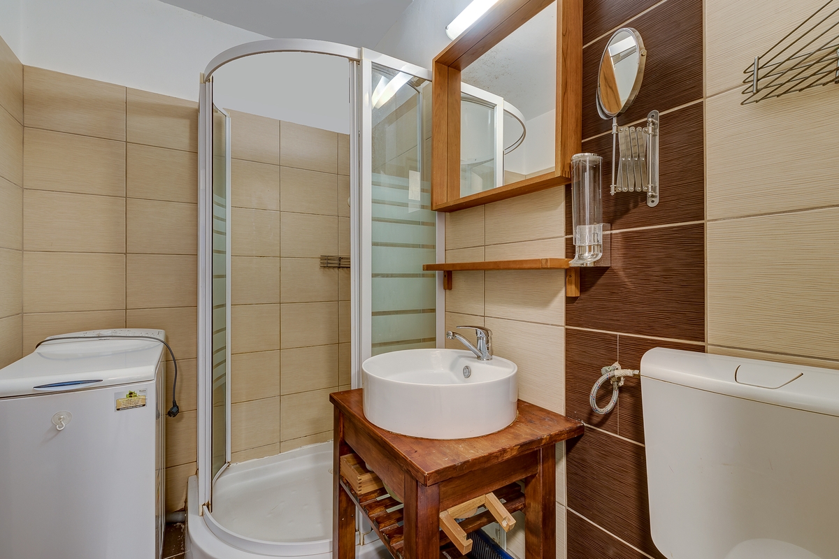 Apartamentul este decomandat, din holul de la intrare in fata este bucataria cu loc de luat masa, in stanga este dormitorul de 12mp si livingul spatios cu iesire spre balconul inchis si inclus in spatiul util. Pe o latura a holului sunt doua spatii de depozitare foarte utile, iar in partea dreapta este baia cu cabina de dus si masina de spalat.