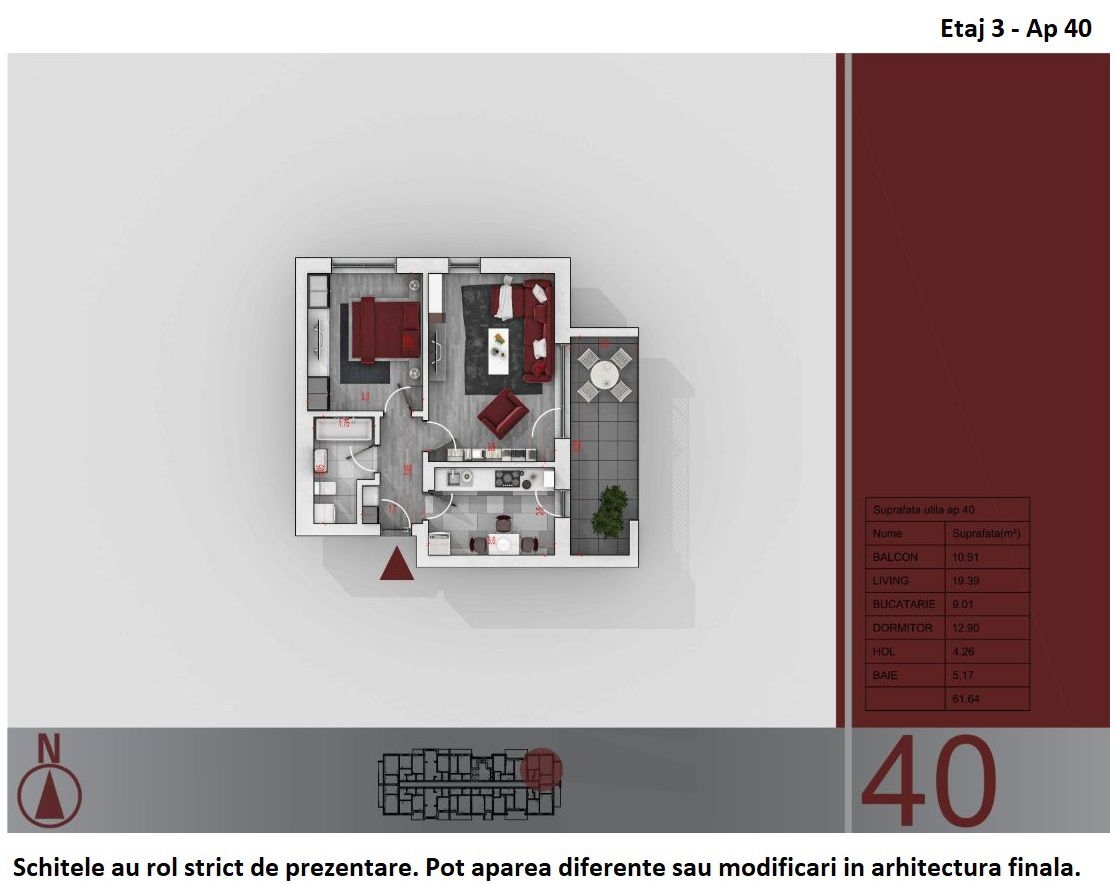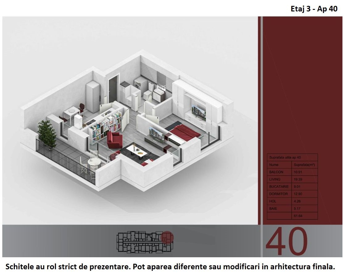 Apartamentul este decomandat si are o suprafata totala de 61.64 mp. Aceasta este alcatuit din 1 camera de zi ,1 dormitor , 1 bucatarie, 1 baie 1 hol si 1 balcon generos.