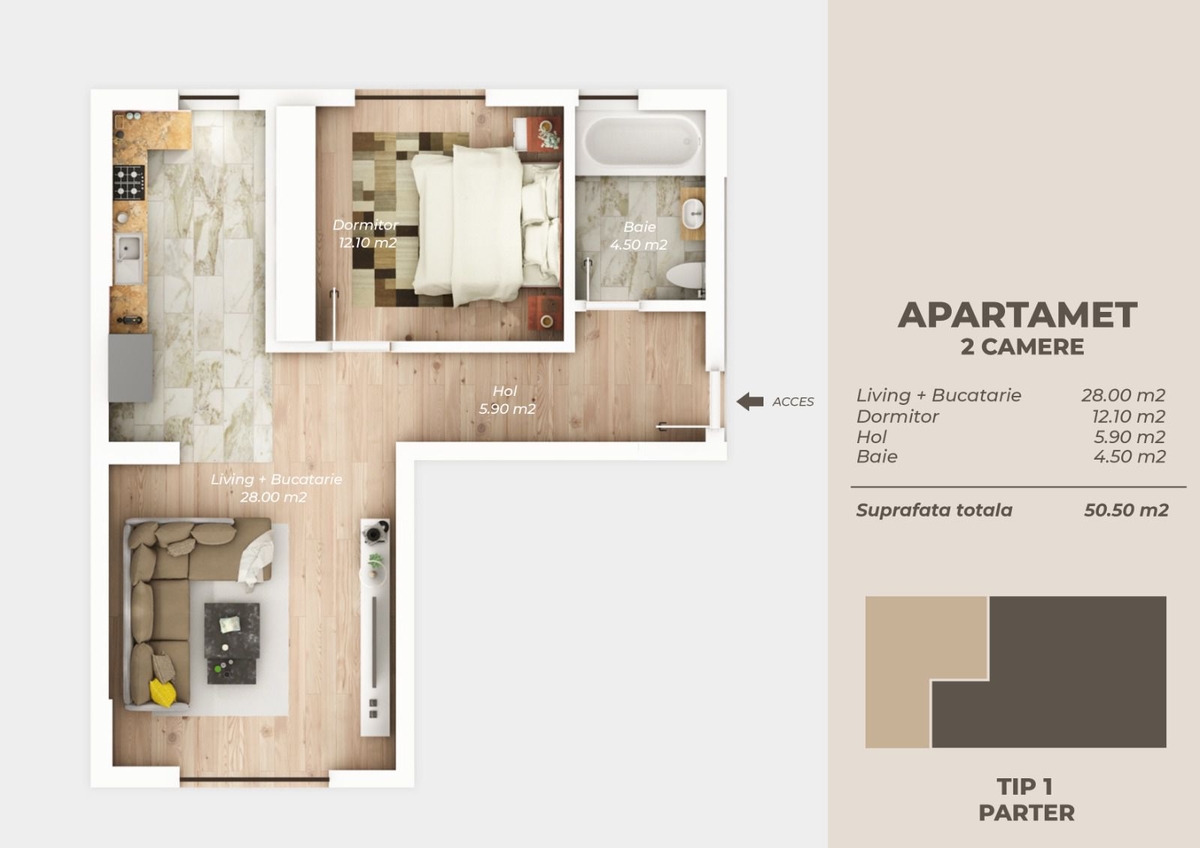 Apartamentul este decomandat si are o suprafata totala de 50.50mp. Aceasta este alcatuit din 1 camera de zi ,1 bucatarie, 1 dormitor ,1 baie si 1 hol .