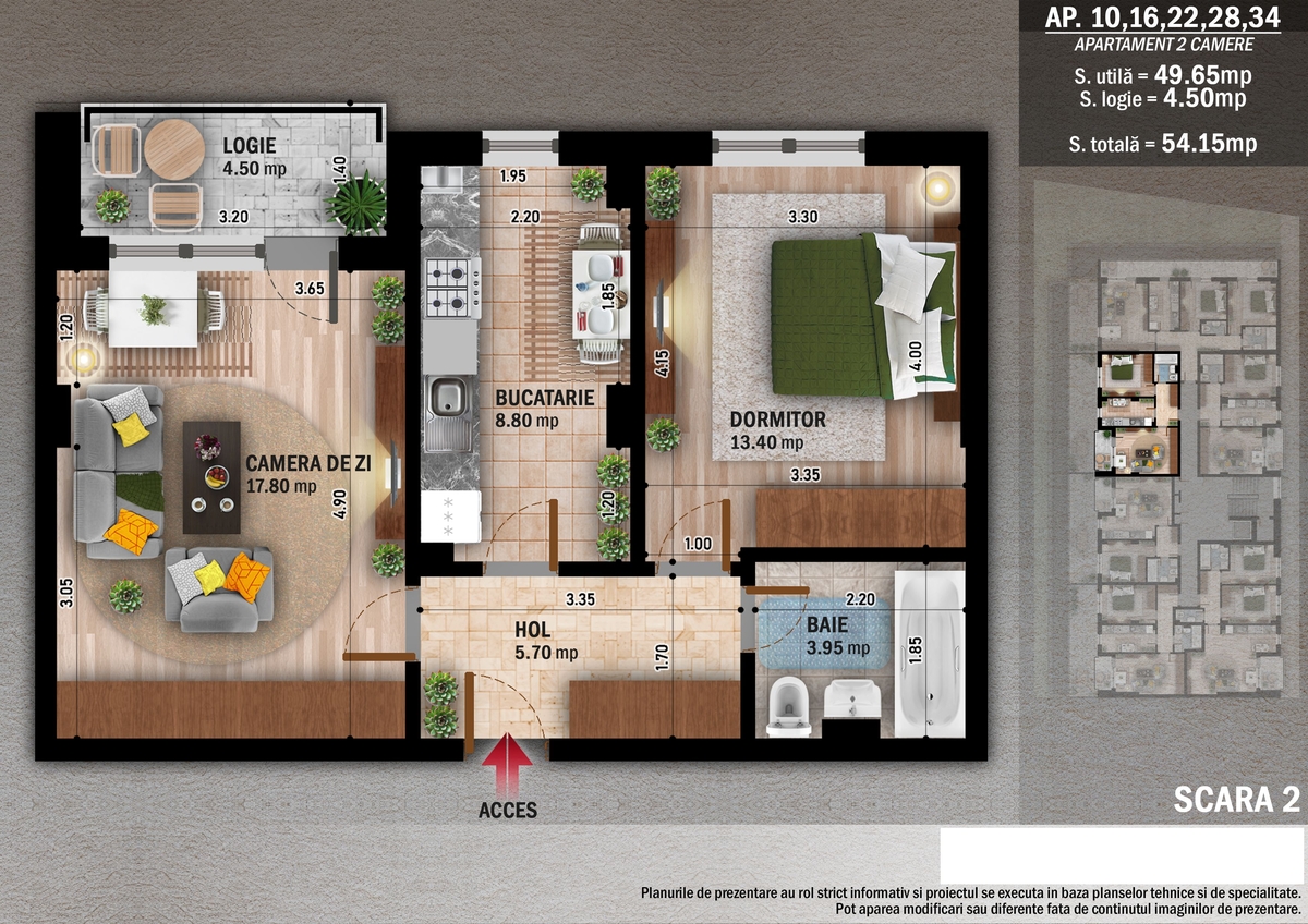 Apartamentul are o suprafata totala de 54.15 mp. Acesta este alcatuit din 1 camera de zi , 1 dormitor ,1 bucatarie, ,1 baie, 1 hol si 1 balcon.