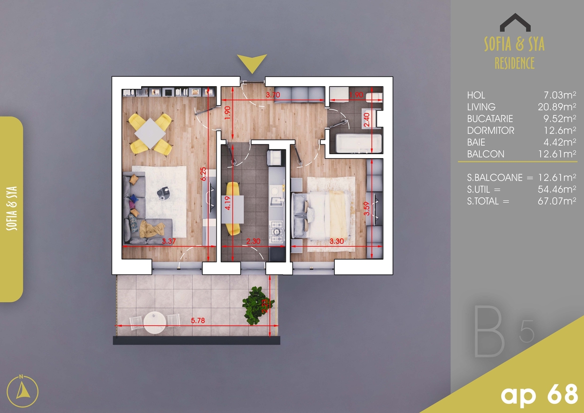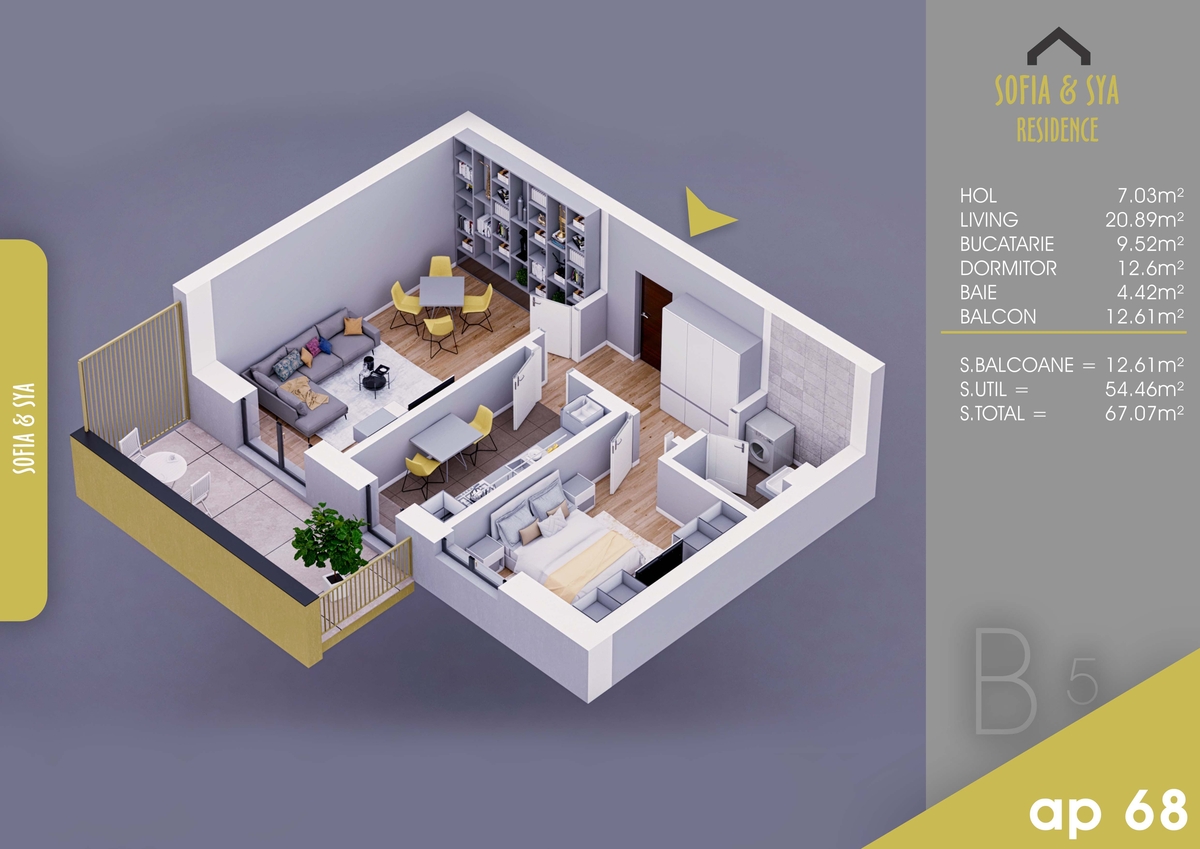 Apartamentul este decomandat si are o suprafata totala de 67.07 mp. Aceasta este alcatuita din: o camera de zi spatioasa, o bucatarie, o baie, un hol si un balcon cu acces din camera de zi si bucatarie.