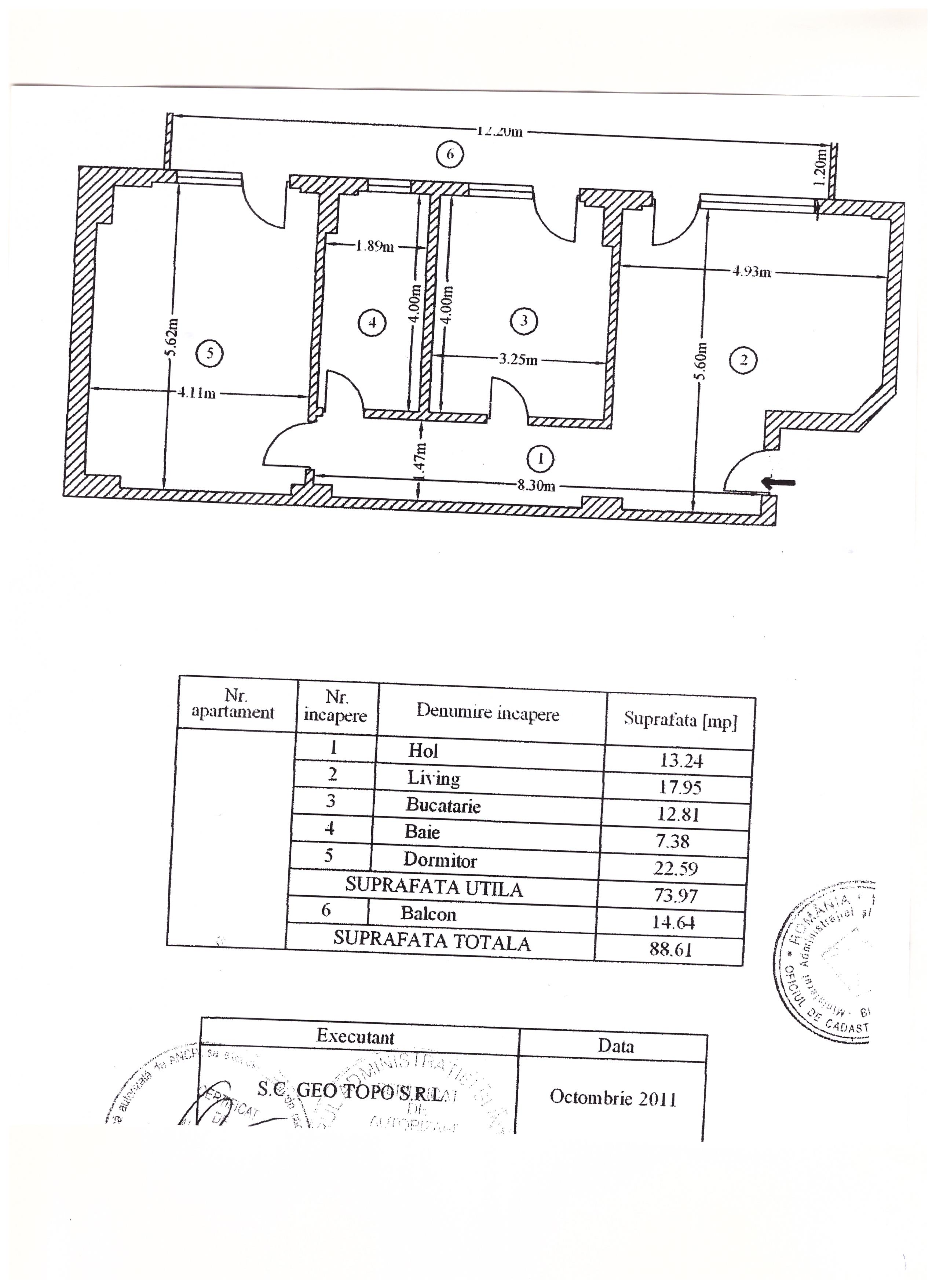 Apartament 2 camere cu suprafata totala de 89mp, decomandat, la etajul 1/6,in bloc edificat in 2011, constructie din stalpi, cadre si plansee de beton si caramida, pereti de compartimentare interioara tot din caramida.