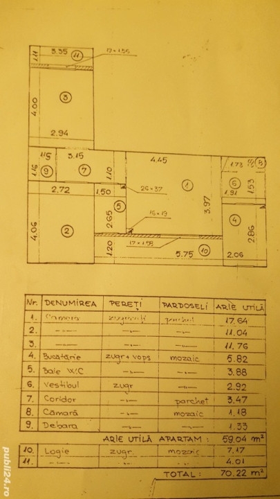 Alcatuit din 3 camere si dependinte, tip apartament semidecomandat, suprafata utila 59 mp, suprafata balcoane 11 mp, suprafata construita 70 mp.