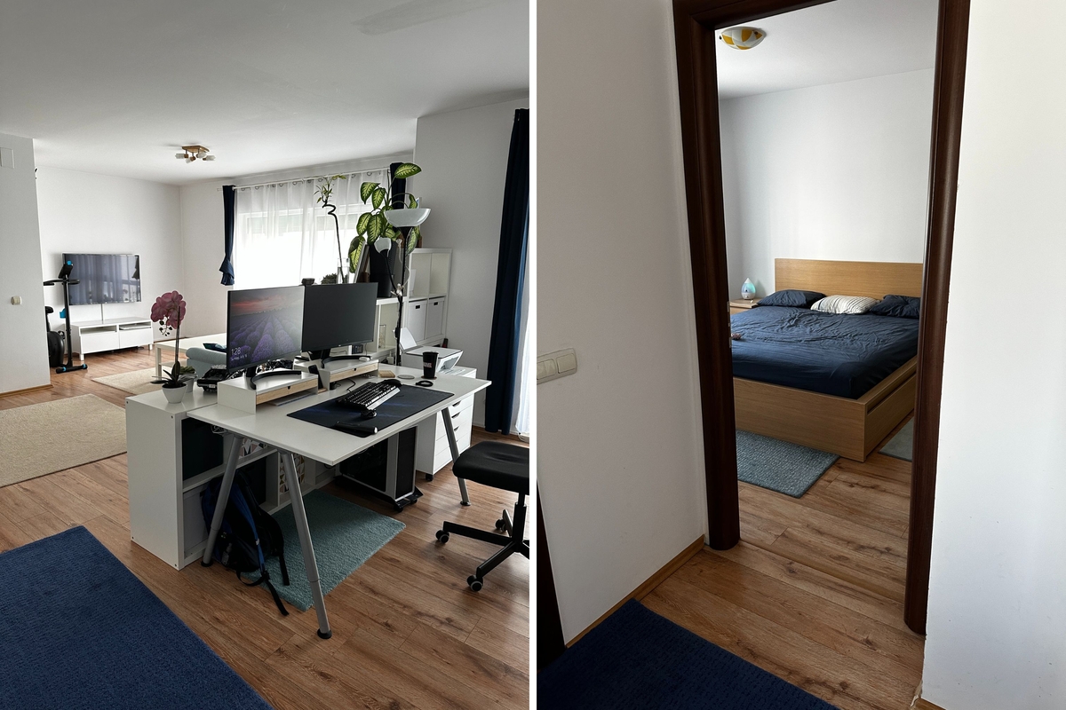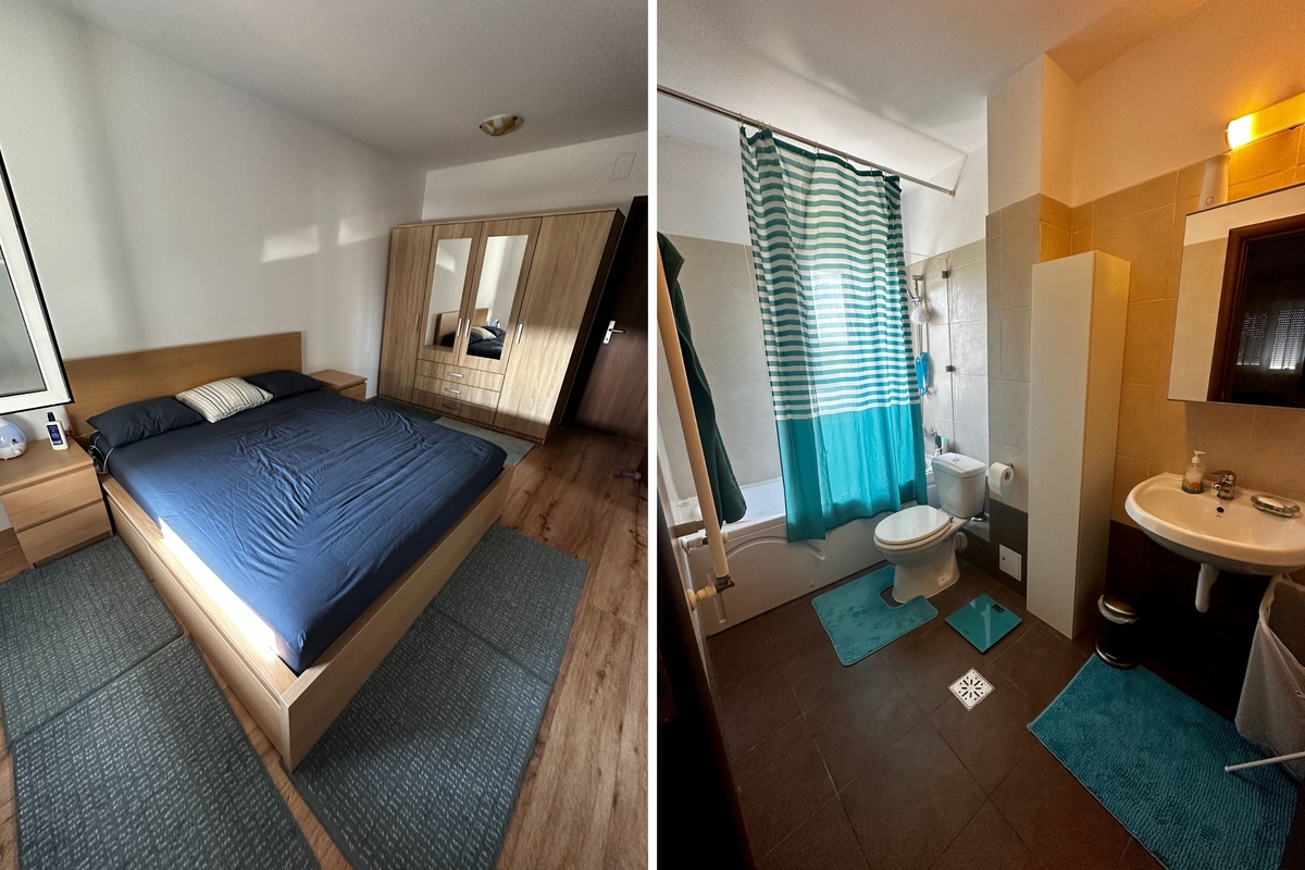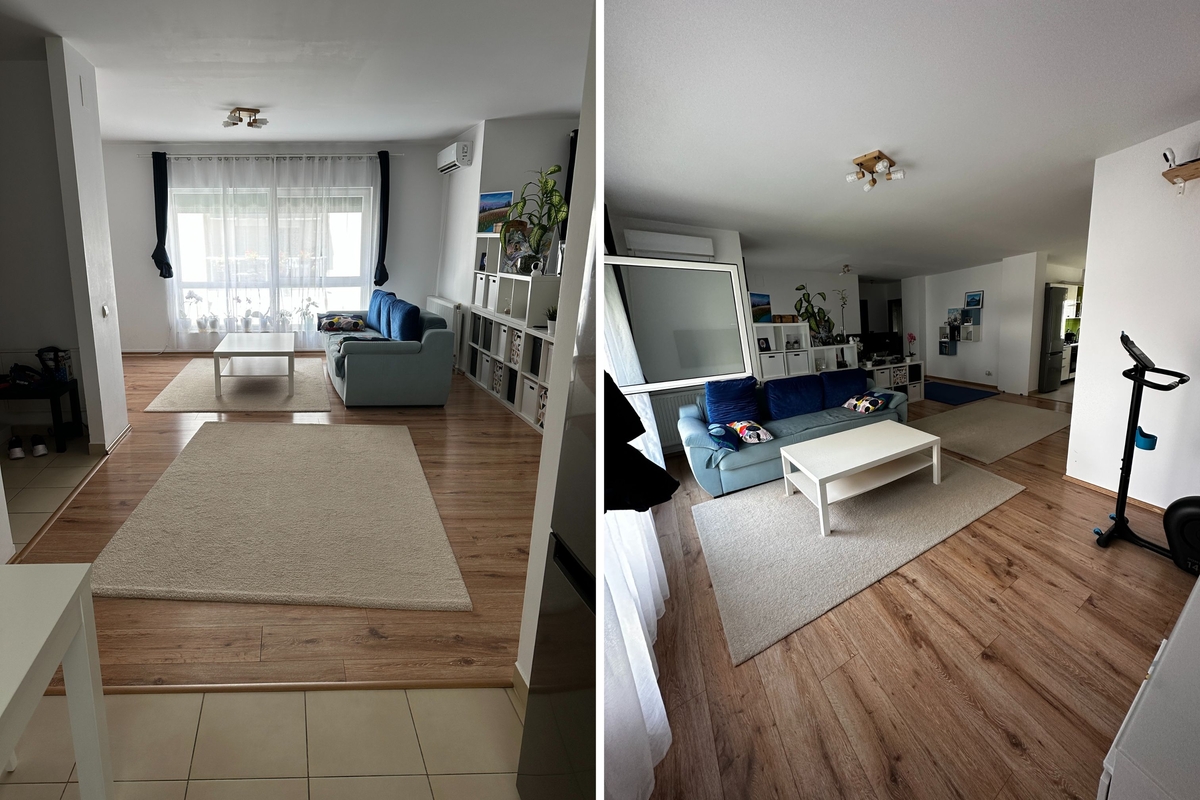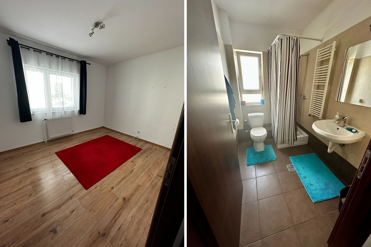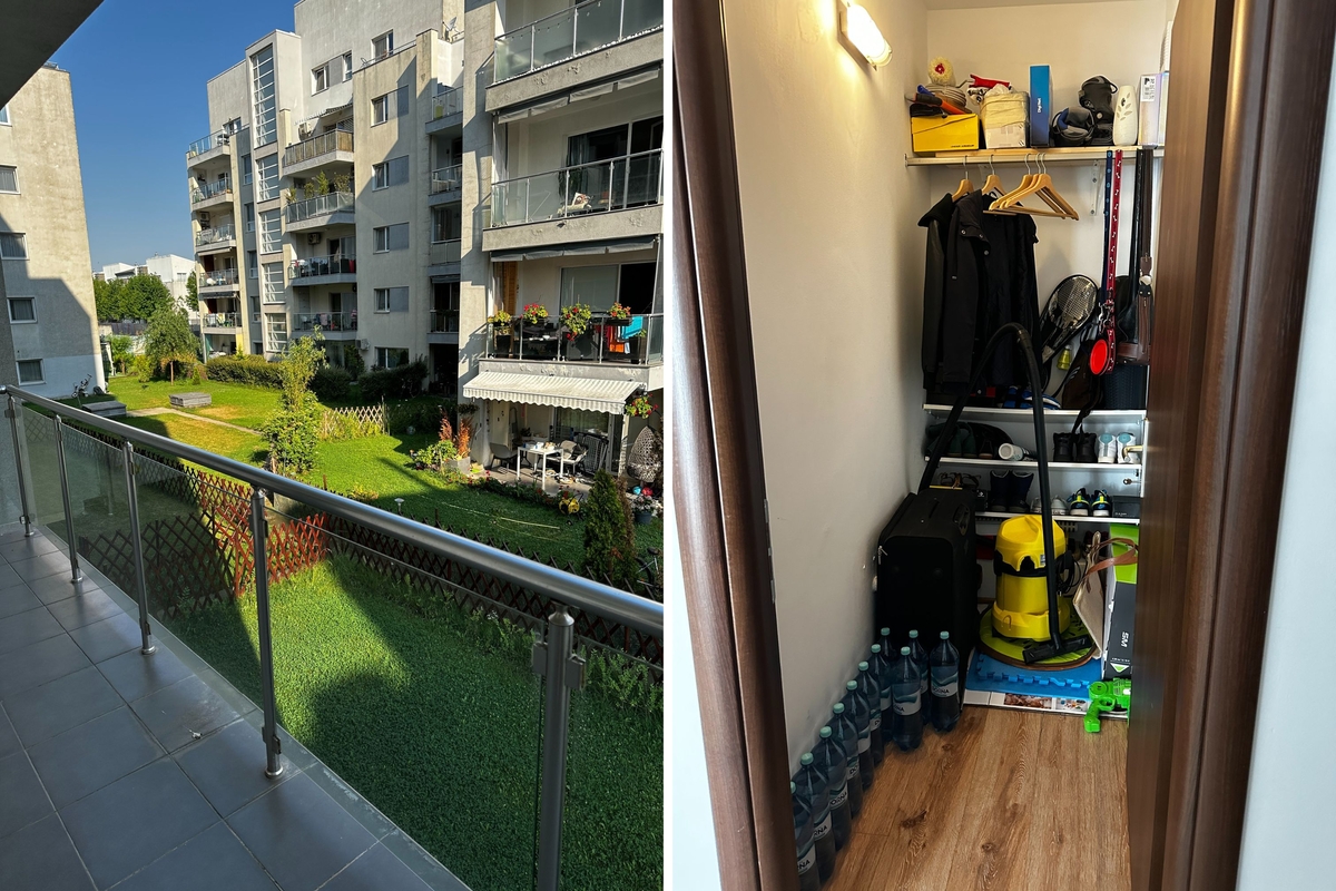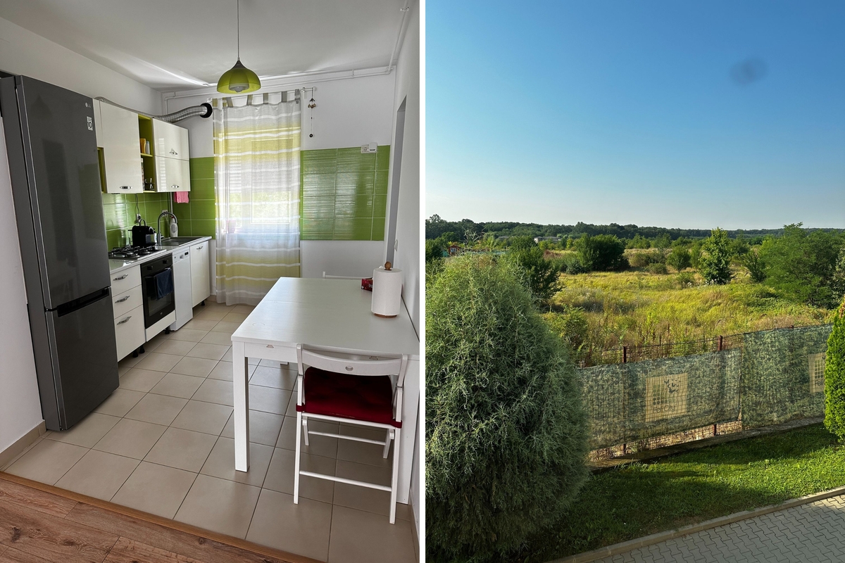 apartament cu 3 camere, 2 locuri parcare subterane, 2 bai (+ un grup sanitar transformat in spatiu de depozitare), intr-un cartier rezidential linistit, cu aer curat, multa natura in jur, parcuri pentru copii cu locuri de joaca special amenajate, teren de baschet, situat in nordul Bucurestiului, langa padurea mica (zona Jandarmeriei) intr-o complex rezidential cu paza 24/7 (BGS). Apartamentul este la etajul 1 si 5, iar blocul are 2 apartamente pe etaj separate de casa scarii si lift. Rasaritul poate fi vazut de la geamul dormitorului matrimonial, interiorul este luminos, spatios si racoros - soarele nu intra direct decat in prima parte a zilei.