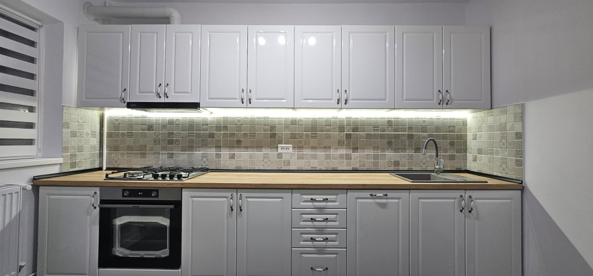 Se vinde mobilat complet, cu mobilier nou, facut pe comanda, si electrocasnice noi: masina de spalat rufe, masina de spalat vase, combina frigorifica, cuptor, plita, hota.