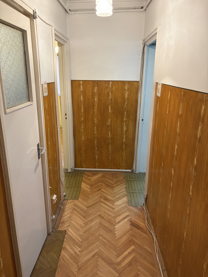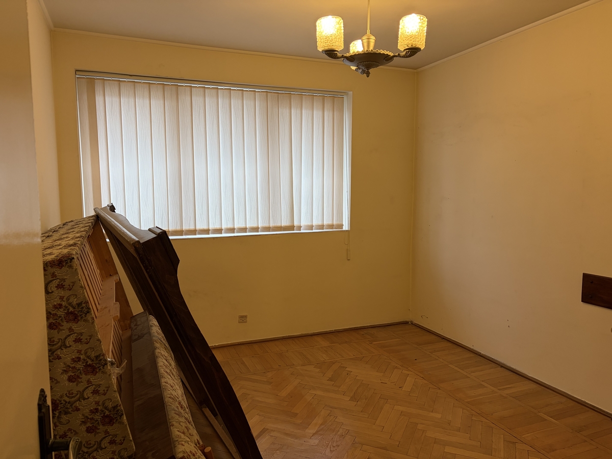 Apartamentul are o suprafata utila de 59 mp +1 balcon inchis in termopan 4,30 m, 33 mp teren in proprietate- cota indiviza, necesita renovare totala, are parchet masiv de stejar in stare buna, fara alte imbunatatiri. Cladirea este solida, fara risc seismic, vedere stradala catre parc si spate, est-vest, zona verde, linistita.