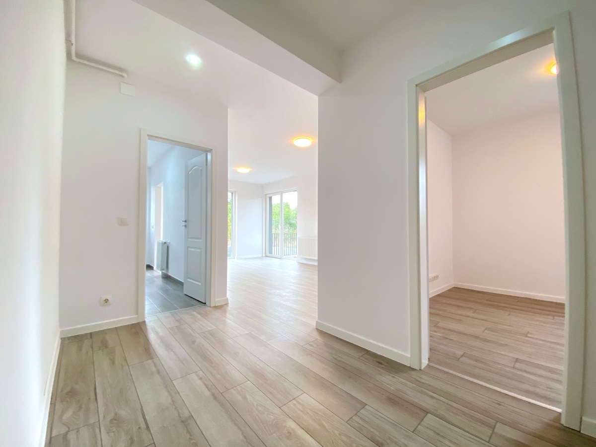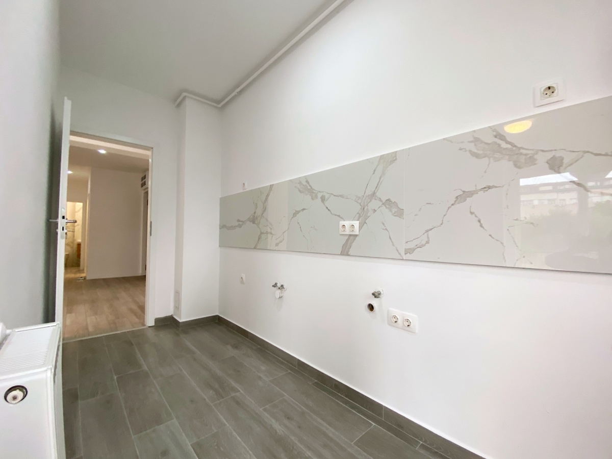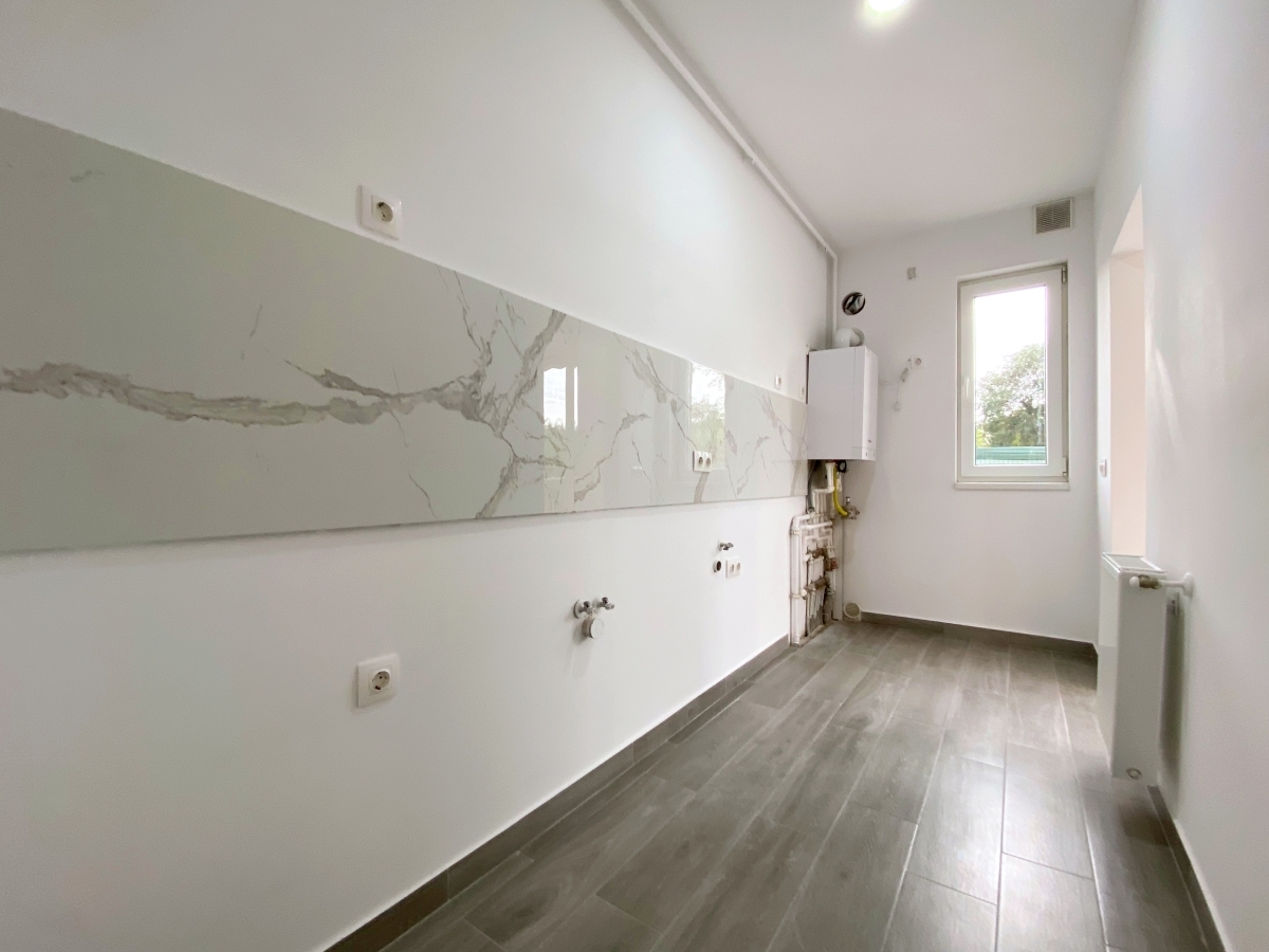 Se vinde complet finisat (exact ca in poze), cu usa metalica Pinum, parchet Egger 10mm, obiecte sanitare Romstal, baterii Grohe si usi interioare din lemn, albe. Corpurile de iluminat si aparatajul electric nu sunt cele mai deosebite, dar sunt eficiente (Philips si Legrand).