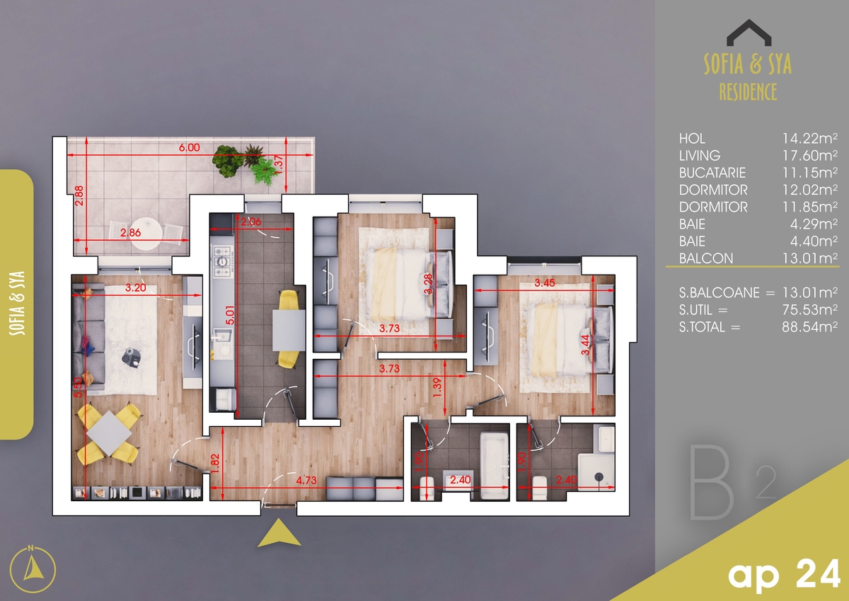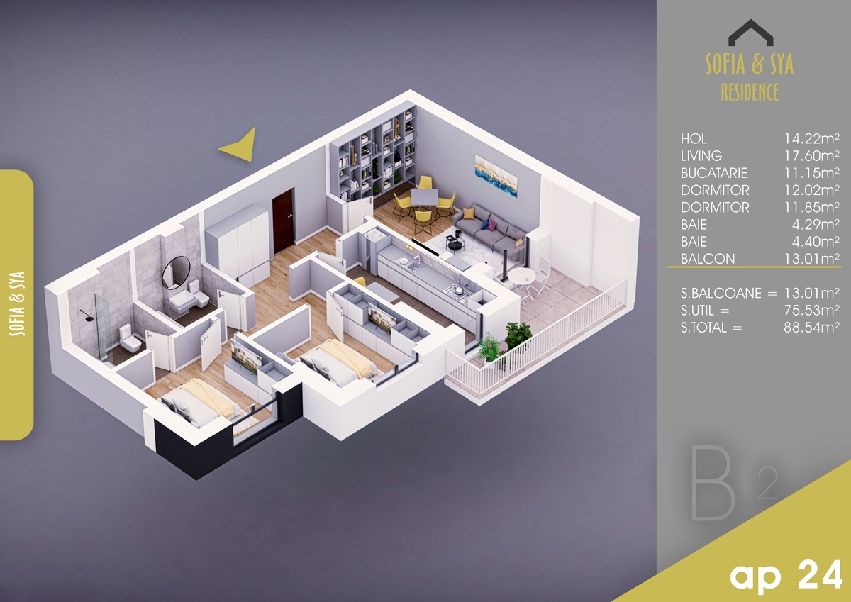 Apartamentul este decomandat si are o suprafata totala de 88.54 mp. Aceasta este alcatuita din: o camera de zi spatioasa, o bucatarie, doua baii,2 dormitoare, un hol si un balcon cu acces din camera de zi si bucatarie.