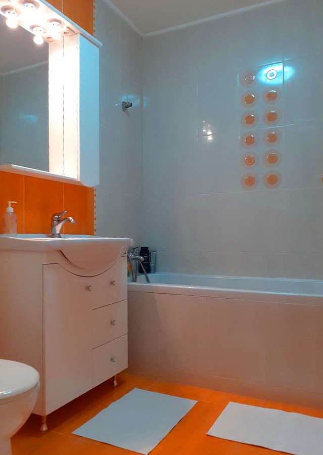 Baia de serviciu contine: cabina de dus, chiuveta cu oglinda, calorifer vertical, vas wc Mondial.