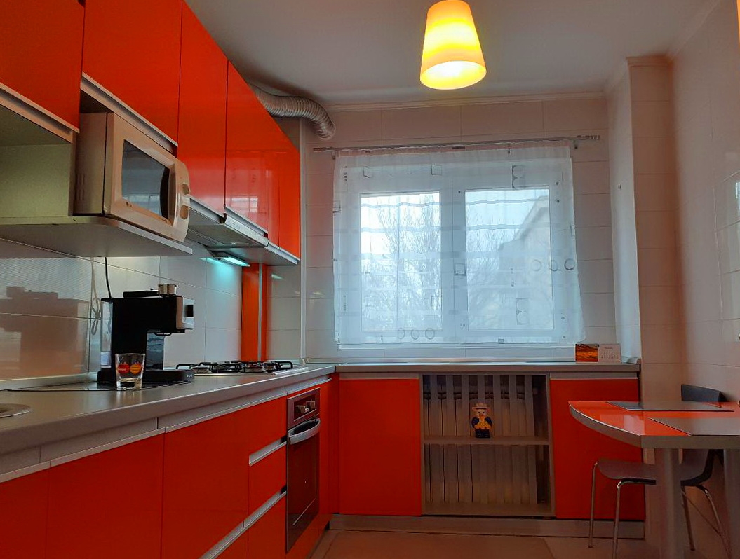 mobilier facut la comanda, cu picurator pentru vase, corpurile au iluminare cu neon cu aprindere electronica, usile si sertarele sunt prevazute cu amortizoare, cos de gunoi atasat pe usa de la masca chiuvetei, cuptor electric Teka cu ventilator incalzire sus-jos + rotisor, plita TEKA cu 4 ochiuri, pe gaz, cu aprindere electrica, hota Teka cu doua motoare, cu iluminare si evacuare a gazelor in exterior, frigider-congelator Siemens (no frost), cuptor cu microunde LG, senzor de gaz metan cuplat la sistemul de alarmare al blocului.