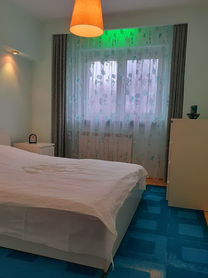 Dormitorul 1 are: galerie din rigips cu lumina verde (de atmosfera), spoturi deasupra noptierelor (in loc de veioze), mobilier Ikea, patul matrimonial are lada pe toata suprafata sa.