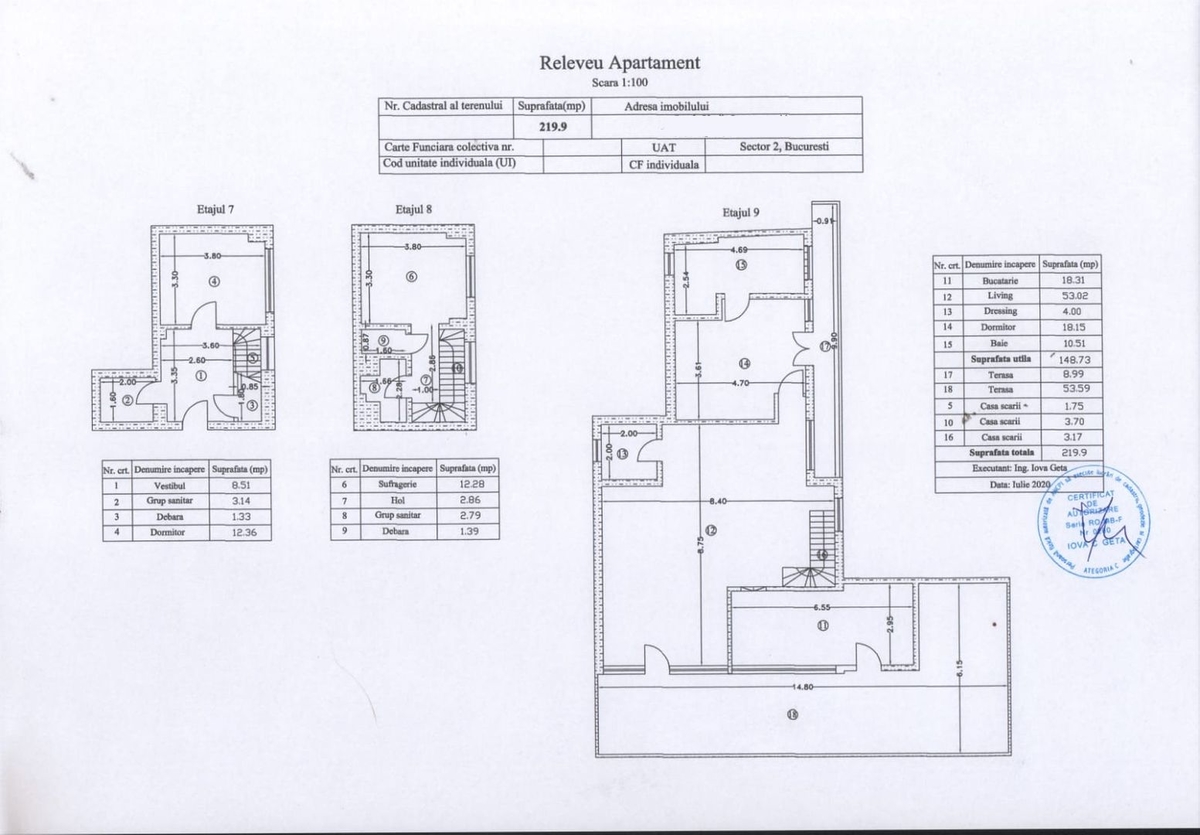 Apartament deosebit, triplex (7, 8 si 9) in inima Bucurestiului, bloc 2005, 150 mp utili, 220 construiti, 4 camere, 3 dormitoare, 3 bai, living, o bucatarie de 19 mp, terasa 54, view superb
