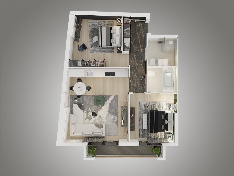 Cu o suprafata generoasa de 73,33 mp, acest apartament decomandat va ofera confortul si spatiul necesar pentru a va crea un camin modern si functional. Compartimentarea este eficienta si practica, incluzand un living luminos conectat la o bucatarie spatioasa, doua dormitoare confortabile, doua bai elegante, un hol generos si un spatiu de depozitare practic. De asemenea, puteti bucura de o terasa cu o vedere spectaculoasa, unde puteti relaxa si admira peisajul.