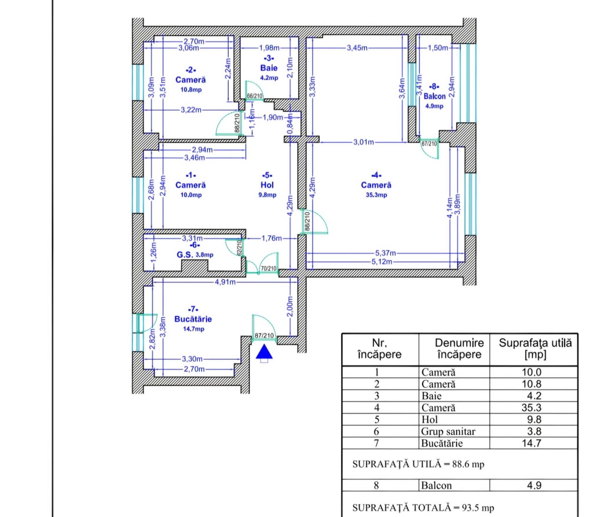 Optiuni interior: 2 grupuri sanitare Aer conditionat Apometre Balcon Izolatie termica Repartitoare caldura Termopan Usa metalica