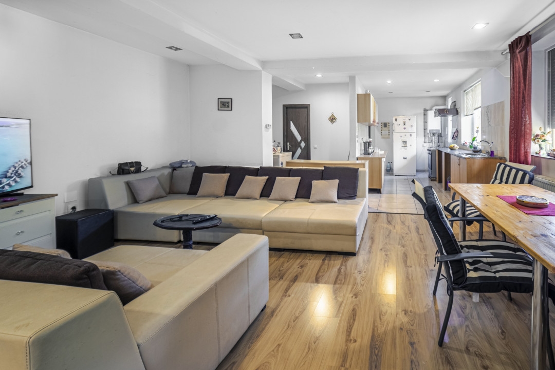 Parterul este compus dintr-un hol de intrare, un living generos de peste 30 mp, o bucatarie open space dar care poate fi inchisa daca se doreste acest lucru, o baie iar in corpul vechi de casa mai avem 2 camere, o baie si un spatiu ce poate fi folosit ca bucatarie sau dressing.