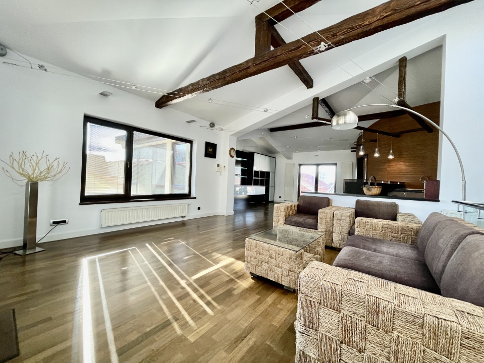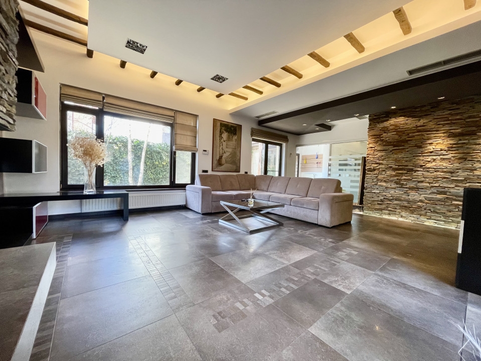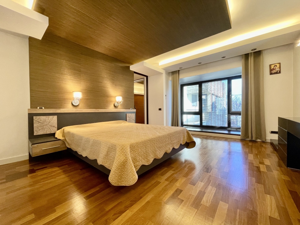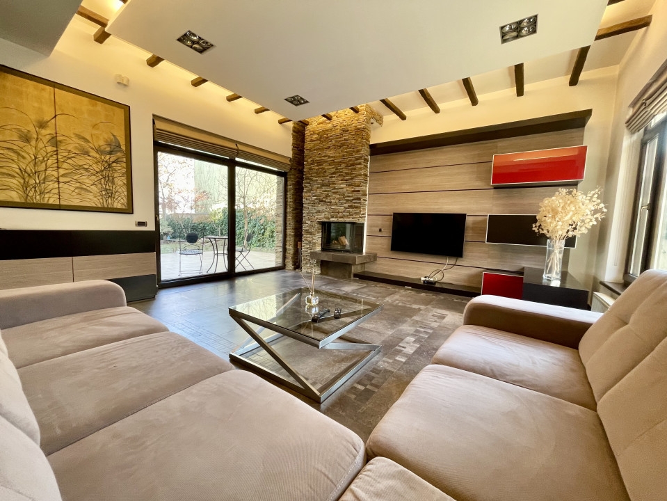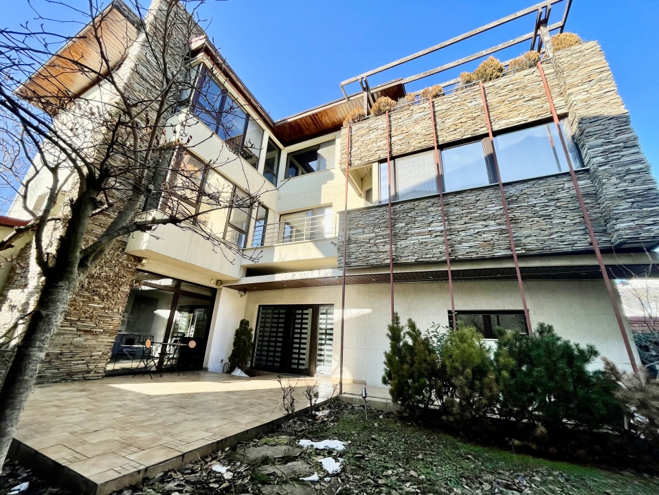 Rezidenta de exceptie din Aviatiei, Bucuresti, cu o suprafata utila de 310 mp si terase de 51 mp, reprezinta o oaza de confort si eleganta. Cele 6 camere, cele 2 sufragerii generoase si cele 4 dormitoare cu bai proprii si terase creeaza un ambient rafinat. Sistemul de incalzire prin pardoseala, calorifere si semineu pe lemne adauga o nota calda. Subsolul bine structurat include camera tehnica, spalatorie, uscatorie si un adapost ALA pentru siguranta. La parter, livingul spatios, bucataria inchisa si zona de dining sunt locuri perfecte pentru relaxare. Etajul 1 surprinde cu cele 3 dormitoare spatioase, fiecare avand dressing, baie proprie si terasa. Mansarda, amenajata ca un apartament, ofera un living generos, mini-bucatarie, dormitor, baie si o terasa superba de 33 mp. Garajul pentru doua masini, accesibil direct din casa, dispune de spatii ample de depozitare si o chiuveta. Terenul de 384 mp include o curte libera de 230 mp, cu un put in fata si un foisor de vara in spate, dotat cu gratar si loc pentru luat masa. Dotarile moderne, cum ar fi sistemul de alarma, video-interfon, aspiratorul centralizat, panoul solar, sistemul de racire HVAC si aerul conditionat in fiecare camera, subliniaza standardele inalte ale acestei proprietati. Descoperiti eleganta si confortul la fiecare colt.