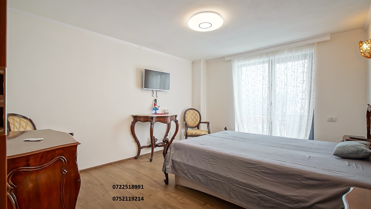 Vila dispune in total de 4 dormitoare, 3 bai, un living spatios si o bucatarie complet echipata, televizor cu ecran plat. Proprietatea ofera acces gratuit la WiFi si parcare privata pentru 7–8 masini. • Etaj: 3 dormitoare cu balcon propriu + 1 baie comuna • Parter: 1 dormitor, living generos, baie, terasa si balcon • Demisol: bucatarie complet utilata (frigider, masina de spalat vase), zona de dining/crama, baie si acces la gradina,