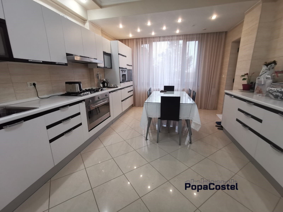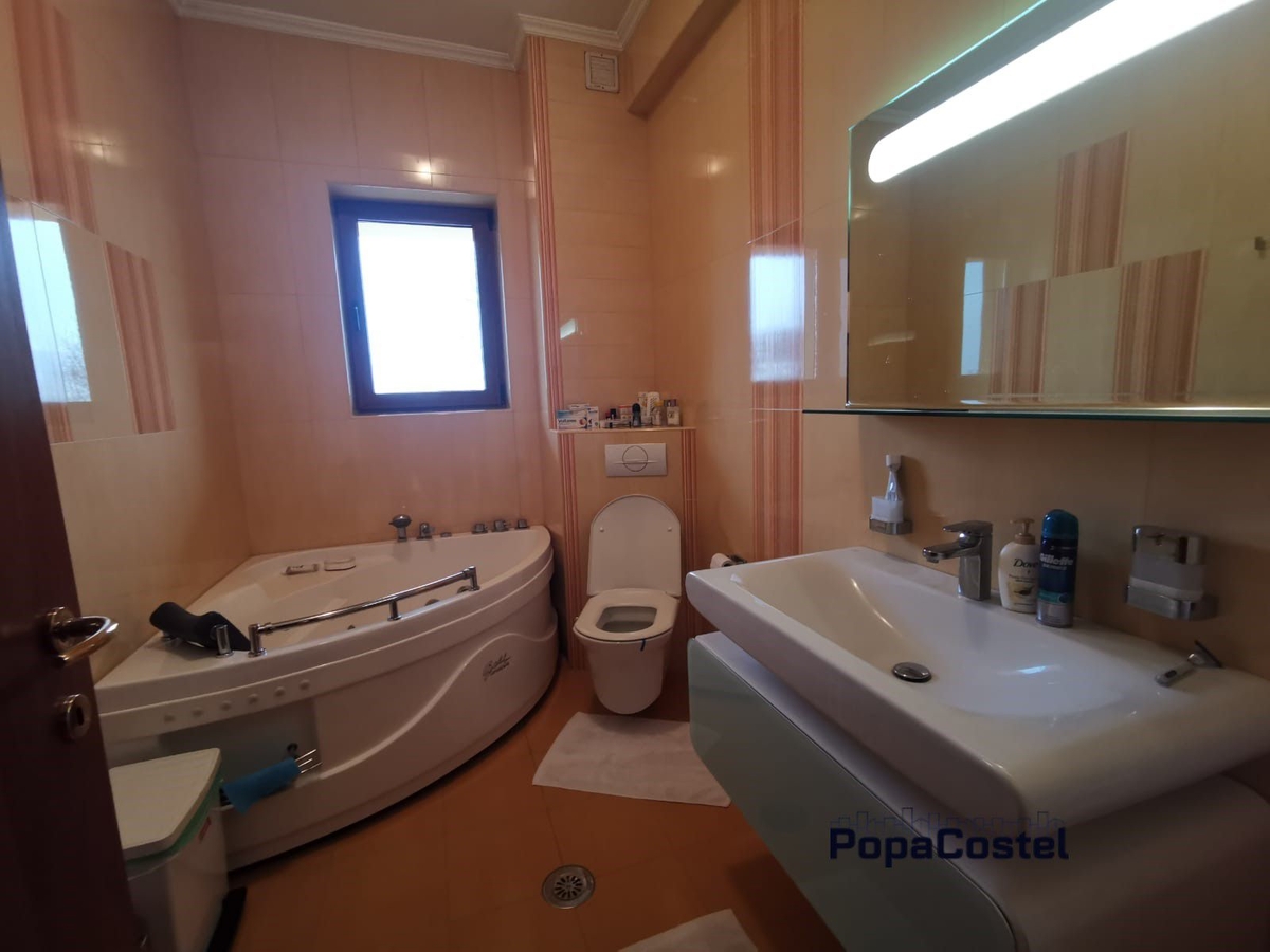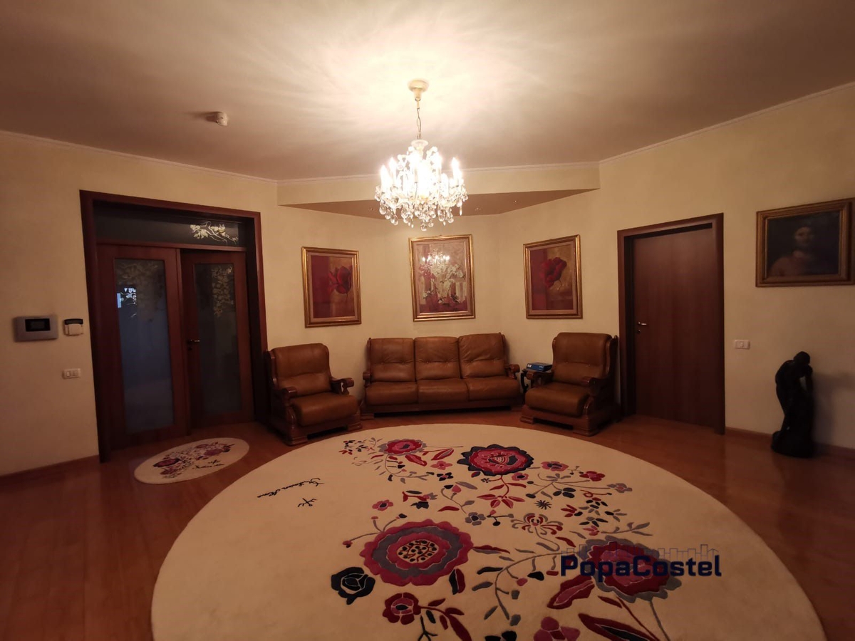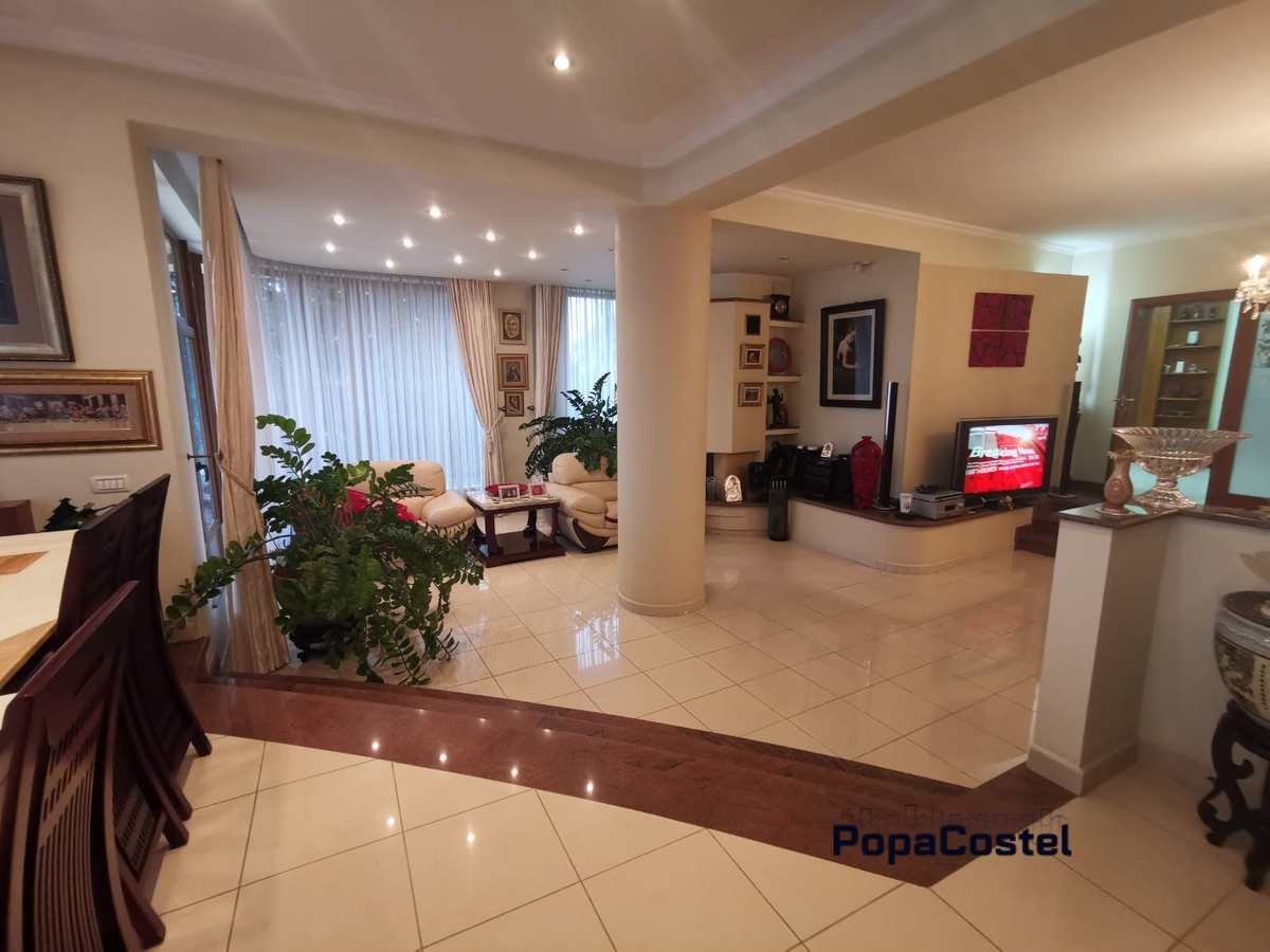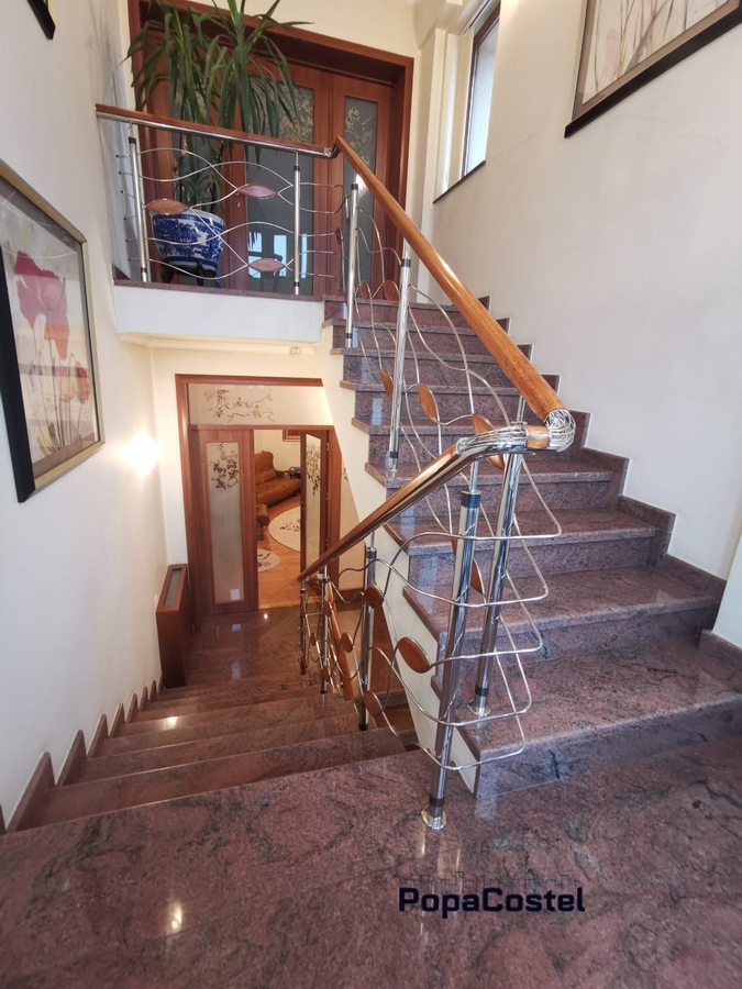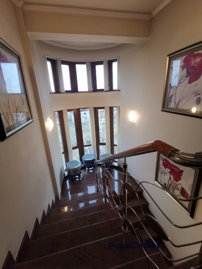 Chiajna Lacul Morii vanzare vila de lux dispusa pe Demisol + Parter + 1 Etaj + Mansarda, cu piscina si ponton la Dambovita, singur curte, construita si finisata in anii 2003-2005. Zidaria este facuta din BCA Ytong si structura din beton armat. Are teren in proprietate 2000 mp, iar la raul Dambovita, unde avem si ponton, este o suprafata de 500 mp concesionata. Imobilul are o suprafata utila de 667 mp, o suprafata totala de 855 mp si o suprafata construita desfasurata de 1026 mp. Demisolul este compus din crama, camara, adapost ALA, camera tehnica; suprafata utila este de 102 mp si cea totala de 123 mp. Parterul contine un living de 83 mp, birou, bucatarie, 1 baie, garaj pentru 2 masini si are o suprafata totala de 249 mp, din care 207 mp este suprafata utila. Etajul este format dintr-un living de 32 mp, 4 dormitoare, biblioteca, sala de sport, 3 bai, 2 terase, 2 balcoane; are suprafata utila de 200 mp si suprafata totala de 263 mp. La mansarda gasim un living de 156 mp si o terasa de 50 mp cu vedere panoramica catre Bucuresti. Finisajele sunt de lux, folosindu-se din abundenta granit si lemn masiv pentru parchet, usi si mobila (aceasta fiind facuta pe comanda), balustradele fiind facute din inox. Portile si usa de la garaj sunt telecomandate. Gradina plina de vegetatie (arbusti, flori) beneficiaza de intimitate si spatiu de relaxare, pe suprafata acesteia aflandu-se o piscina de 83 mp, o magazie si un foisor. In zona debarcaderului avem o livada terasata cu multi pomi fructiferi. Suntem agentie imobiliara si percepem comision. Mai multe oferte, detalii si informatii gasiti pe site-ul nostru: PopaCostel.ro