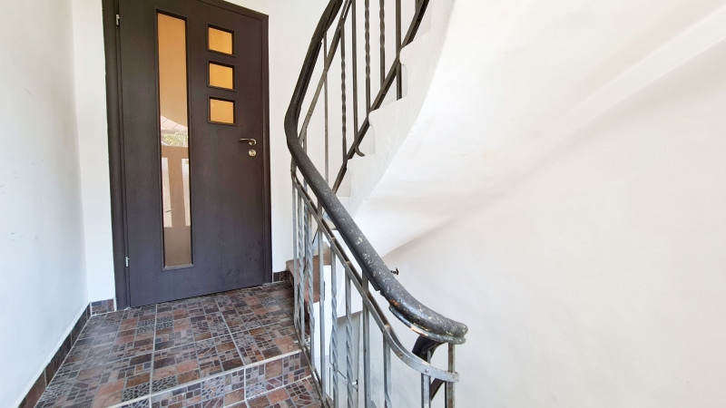 Dar partea cea mai interesanta abia acum vine. Parterul este singurul nivel cu acces dublu, principal fiind cel din fata cladirii. In partea stanga a imobilului exista scara de serviciu, suficient de larga, dealtfel, care face accesul catre fiecare nivel in parte, putandu-se astfel imparti in 3 apartamente distincte ce pot fi locuite de cate o familie. Si, din acest motiv, nu ma pot gandi decat la urmatoarele variante: