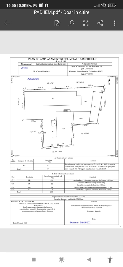 Proprietar persoana fizica (comision zero) vand proprietate la Constanta zona Dacia (2 km) de plaja. Se preteaza oricarei persoane care isi doreste o afacere langa locuinta. Acces facil la orice mijloc de transport, gradinite, scoli, dispensar, centru comercial Mega Image, Carrefour, o statie pana la City Park Mall, doua statii pana la Vivo Mall, 4 statii de centrul vechi si Portul Constanta. Casa este compusa din: 2 parti de casa cu 3 intrari separate, 4 camere, in fiecare parte cate o bucatarie, o baie cu cada inauntru, pot locui lejer 2 familii, iar in curte un grup sanitar, 2 anexe, pod peste toata casa si o terasa acoperita. Casa are 120 mp, o parte este din caramida plina iar cealalta este din material mixt, curtea 159 mp cu terasa, anexele 29mp din caramida plina. In curte se afla imobilul D+P+E cu acces si din strada si din curte, 189 mp fost spatiu comercial din constructie la parter unde se poate relua o activitate comerciala oricand (cf cadastru) sau se poate inchiria daca se doreste, bineinteles poate fi si locuibila (se pot realiza 5 garsoniere cu baie de inchiriat ptr sezon sau ptr locuit tot timpul, numai in aceasta cladire, fara cele doua case amintite mai sus). Cladirea este construita in 1997, este pe cadre de beton cu tencuiala din bca. Spatiile din cladire au podeaua din mozaic. Atat casele din curte cat si imobilul etajat au utilitati separate astfel: centrala pe gaz cu contoar separat, facturare separata ptr cele doua case din curte, la fel si la energie electrica; la parterul imobilului exista un convector de gaz cu contoar separat, facturat separat, la fel si la energie electrica; la etaj este centrala pe gaz, contoar separat, facturat separat, la fel si la energie electrica. Demisolul cu parterul si cu etajul au fiecare intrare separata din strada, iar demisolul si parterul au intrare si din curte. Apa este comuna pentru toata proprietatea. Aceasta proprietate se preteaza unei familii (persoane) care va putea locui in cele doua case din curte, iar imobilul etajat va deveni sursa sa de venit stabila fie prin prisma inchirierii unor garsoniere pentru sezon sau pe termen lung sau poate deschide o afacere, mai ales ca in zona nu se afla nici magazin alimentar nici bar sau cafenea sau pot fi identificate si alte necesitati. Total mp construiti 400. Proprietatea se afla la intersectia a 6 strazi, pe mijlocul intersectiei se afla o parcare de masini si este foarte intens circulata, zona de case, vile si blocuri. Toate actele sunt la zi. Necesita usoare renovari si adaptari on functie de ceea ce se decide fiecare sa realizeze. Trimit poze pe WhatsApp/ Fb. Proprietatea se vinde cu 298.000 euro. Nu sunt agentie imobiliara;