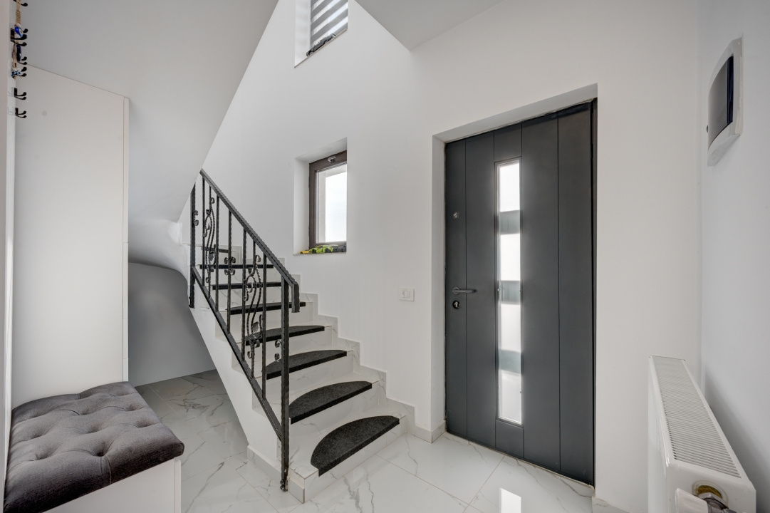 Bucataria este complet mobilata si utilata (aragaz, hota, masina de spalat vase, frigider). Dormitorul de la parter este amenajat cu un dulap generos si birou. Livingul este amenajat cu o canapea, comoda TV si spatii pentru depozitare. Fiecare dormitor are pat iar cel matrimonial are amenajat un dressing deschis.