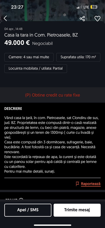 vand casa plus teren 5.000 mp in comuna Plataresti, Dorobantu. Casa are un etaj plus mansarda, la parter se afla un dormitor, un living, o bucatarie, o baie si o camara. La etaj sunt 4 dormitoare si o baie. Garajul este lipit de casa, Curtea are o poarta pietonala si doua porti pentru autoturimse. In curte se afla un solar mare si unul mic pentru cultivat, trei magazii, foisor inchis cu doua gratare, unul inauntru si unul afara. Gratarul din inauntru contine vatra si doua cuptoare pentru paine, garaj spatiu 4 masini camera tehnica unde este centrala cu intrare in garaj. Utilitatile din curte sunt urmatoarele: curent electric, apa, centrala pe lemne, hosa mare, boilere in fiecare baie. Pentru mai multe detalii si poze contactati-ma. Pretul este negociabil. Rog si ofer seriozitate