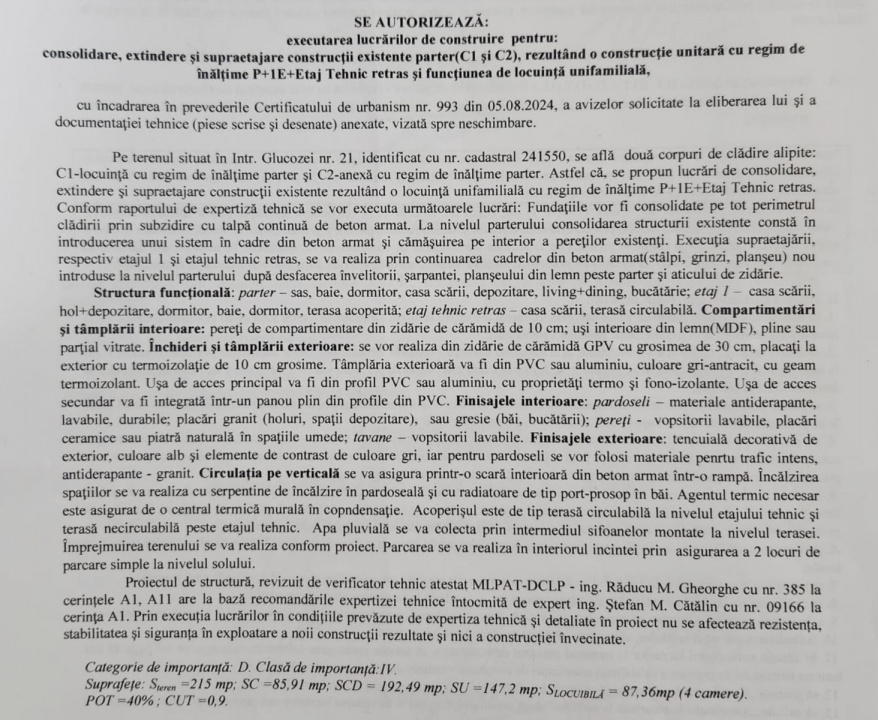 Pentru proprietate exista deja un proiect profesional de extindere si consolidare, iar autorizatia de constructie este emisa si valabila.