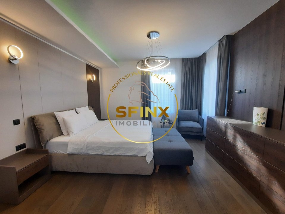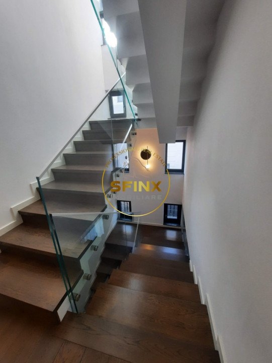 Etaj 1: dormitor matrimonial, dresing, baie cu dus, terasa; dormitor secundar, baie stil spa, cu dus si cu cada, balcon.