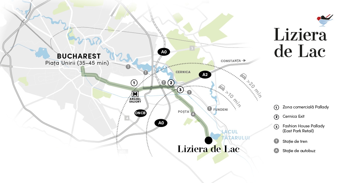 Locatie: in estul Bucurestiului, cu acces facil catre oras prin A2 (iesire Cernica, la aproximativ 15 minute), in localitatea Frumusani. Statia de metrou Anghel Saligny se afla la circa 20 de minute, cu transfer privat dedicat rezidentilor. Dezvoltarea autostrazii A0 va consolida suplimentar accesibilitatea si valoarea zonei.