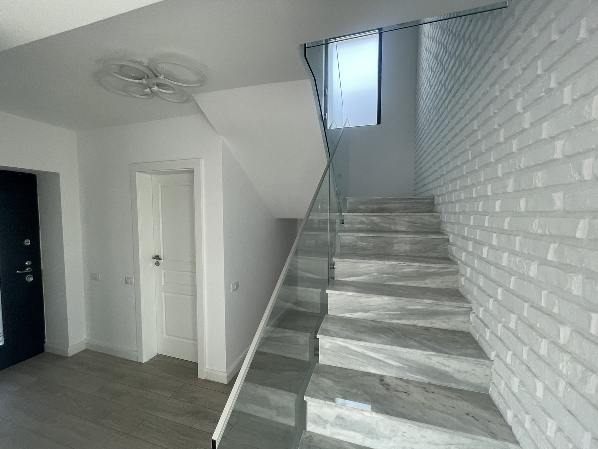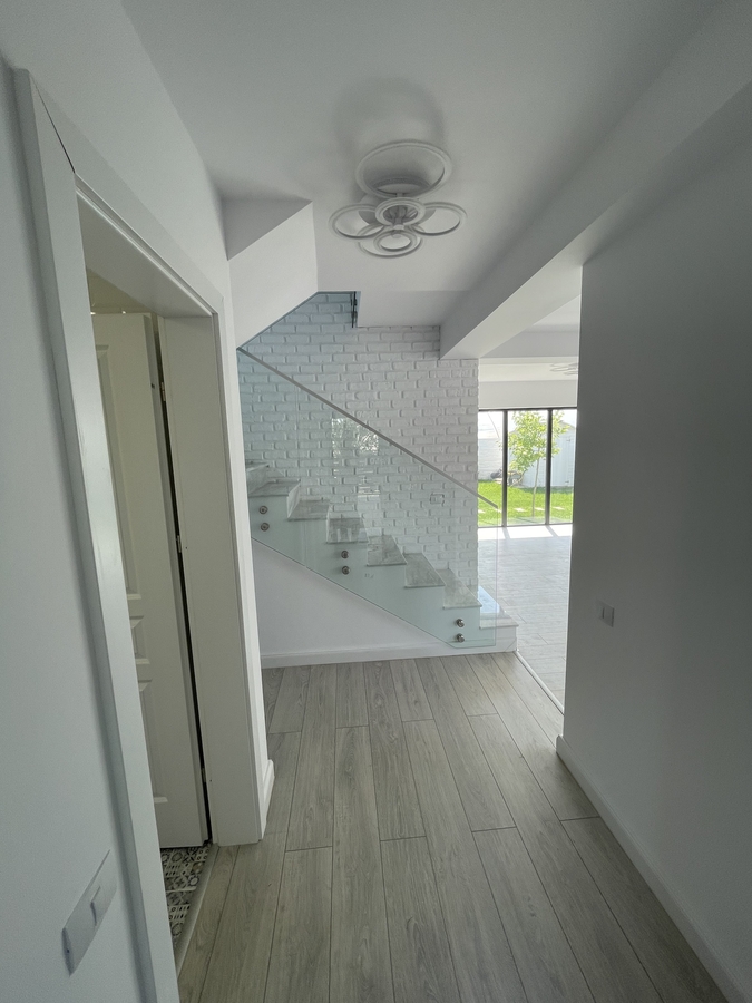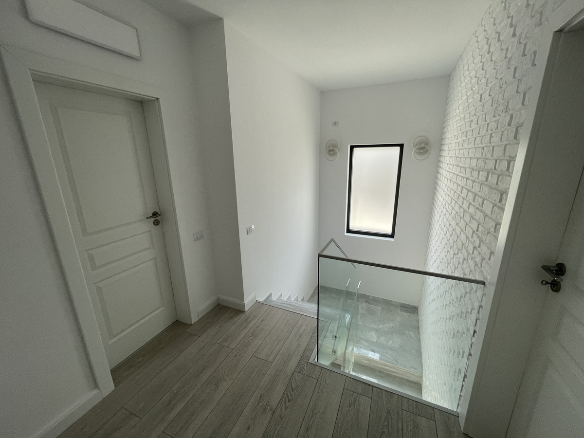 Scara interioara este realizata din beton si este placata cu marmura iar balustrada este realizata din sticla securizata, parchet laminat de 12 mm Kronotex (clasa trafic 33), plinta Mdf Egger Hamburg, Incalzire in pardoseala atat pe parter cat si pe etaj cu grupuri de amestec separate, instalatia electrica realizata cu circuite dedicate, 2 tablouri separate, casa dispune de lustre LED cu telecomanda (lumina calda sau rece, reglarea intensitatii luminoase), vas de toaleta incastrat, cada Freestanding, oglinzi rotunde cu led, ceas si functie de dezaburire in ambele bai, tamplaria Gealan S8000, usi interior Porta Doors, usa metalica Bella Casa ''Amsterdam''.