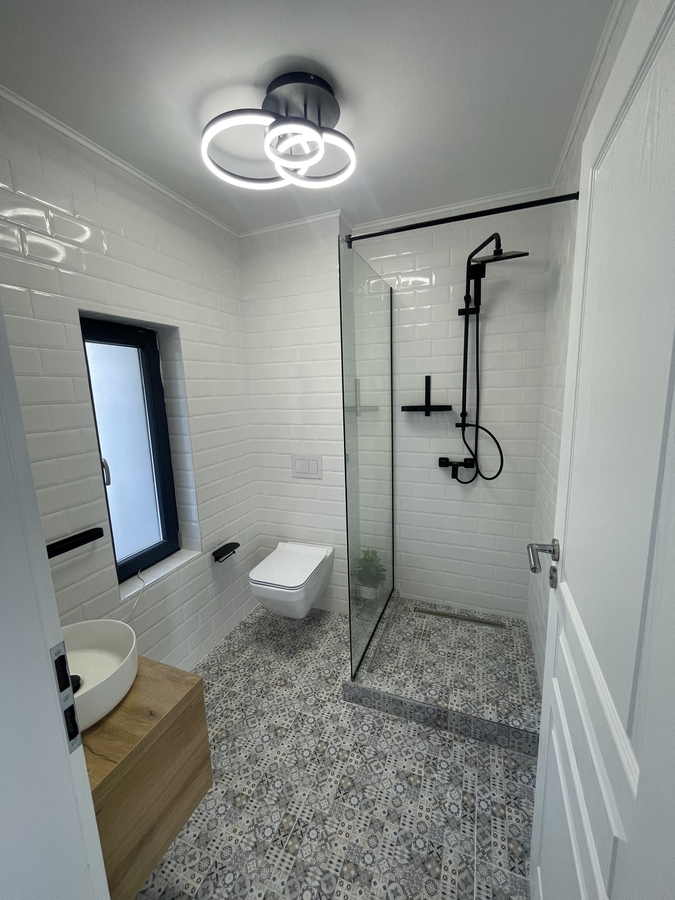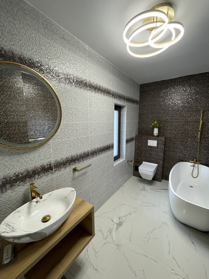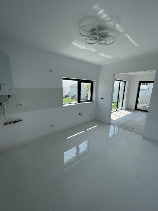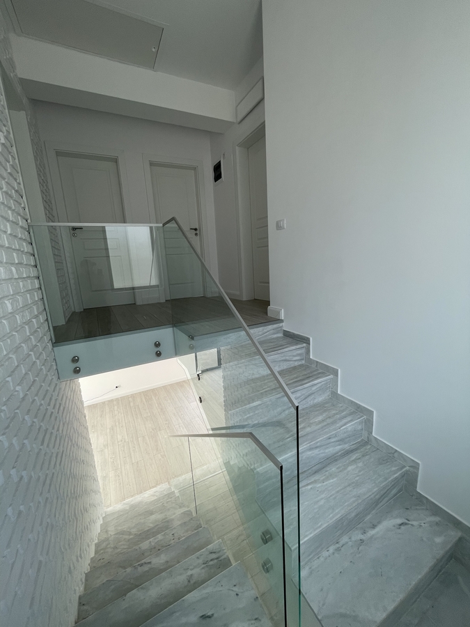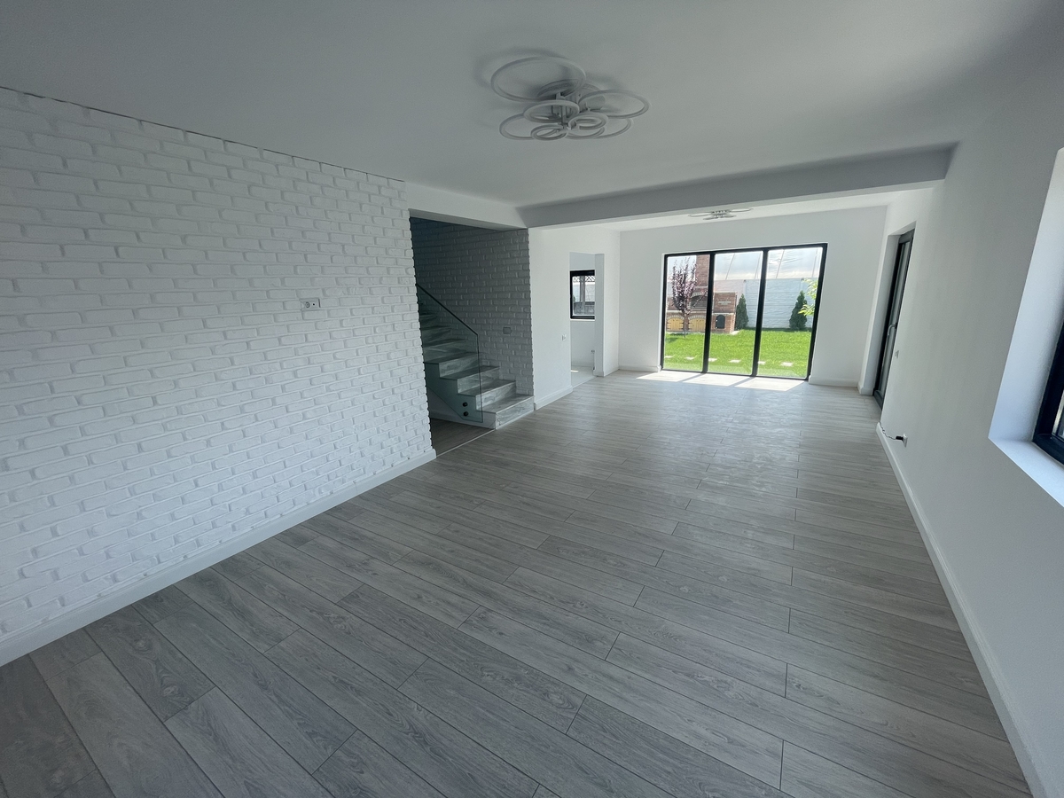 Scara interioara este realizata din beton si este placata cu marmura iar balustrada este realizata din sticla securizata, parchet laminat de 12 mm Kronotex (clasa trafic 33), plinta Mdf Egger Hamburg, Incalzire in pardoseala atat pe parter cat si pe etaj cu grupuri de amestec separate, instalatia electrica realizata cu circuite dedicate, 2 tablouri separate, casa dispune de lustre LED cu telecomanda (lumina calda sau rece, reglarea intensitatii luminoase), vas de toaleta incastrat, cada Freestanding, oglinzi rotunde cu led, ceas si functie de dezaburire in ambele bai, tamplaria Gealan S8000, usi interior Porta Doors, usa metalica Bella Casa ''Amsterdam''.