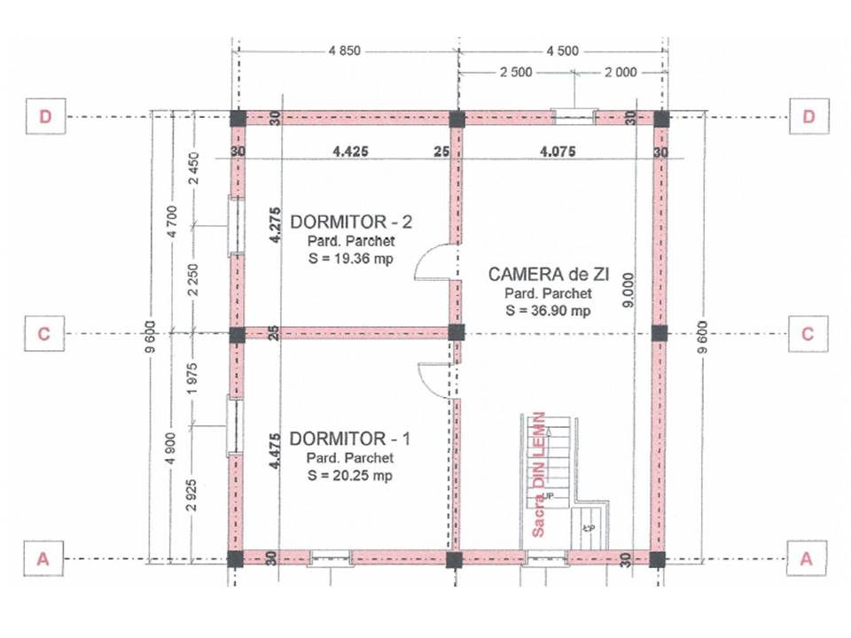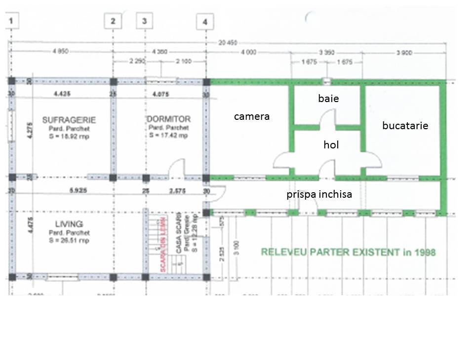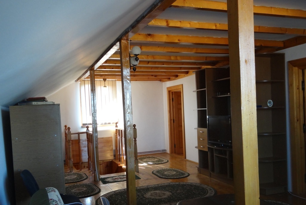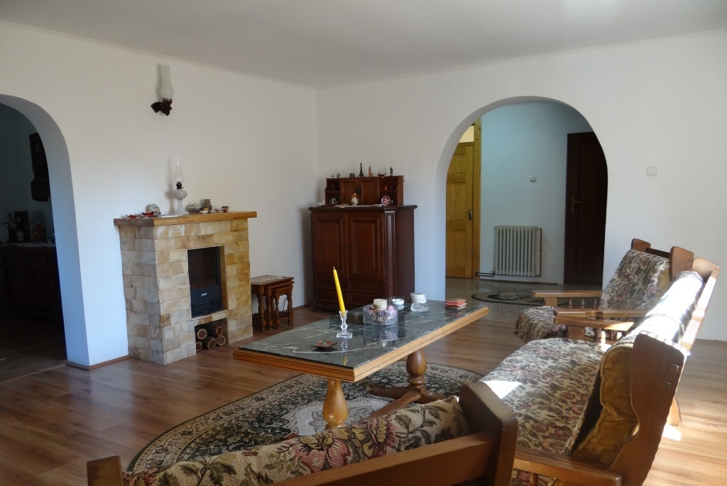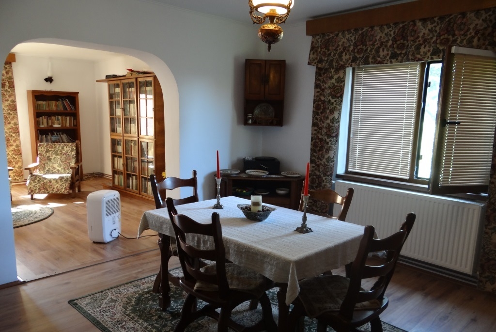 - etaj(75mp) = scara acces, living si 2 doua dormitoare dotate fiecare cu aparate de aer conditionat. Tamplarie exterioara tripan, interioara lemn. Casa si podul sunt izolate, exterior vopsea decorativa. Casa noua este incalzita cu calorifere, centrala termica pe lemne sau carbuni montata in prispa inchisa.