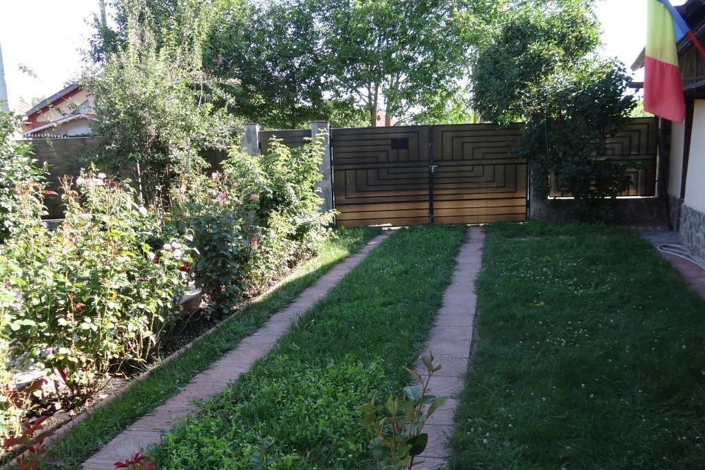 Curte - 1700 mp din care 800mp livada(cca 75 pomi fructiferi pe rod), gazon, ronduri trandafiri, lalele, iasomie, magnolie, etc, instalatie de udat cu aspersoare si bazine apa, masina de tuns gazon si trimer. Curtea este imprejmuita cu gard metalic montat pe soclu din beton. In curte sunt doua constructii, o casa noua lipita de o casa veche si o constructie anexa C2. Acces in curte pietonal sau auto, alee pietonala pietruita si alei pavelate pentru auto.