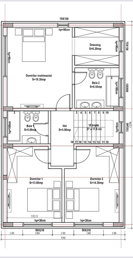 Etaj 1: 3 dormitoare, dintre care un dormitor matrimonial cu baie si dressing proprie, la care se adauga si o baie comuna