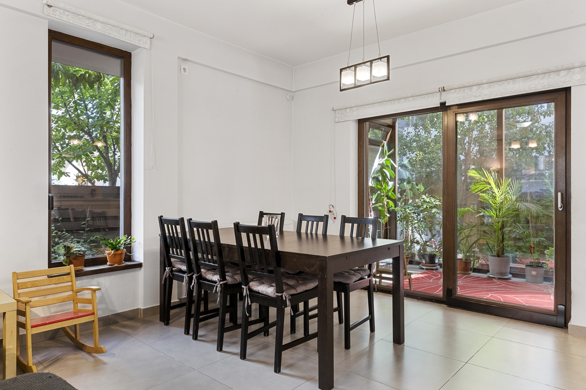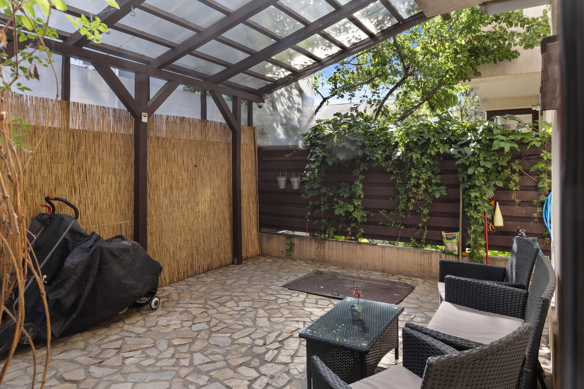 In curtea din spate, terasa a fost inchisa cu aceeasi tamplarie ca restul casei.