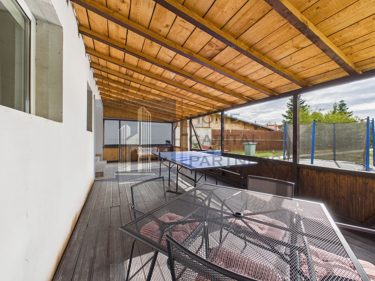Terasa acoperita, cu vedere catre curtea verde, este perfecta pentru seri in familie, jocuri de ping-pong sau cine de weekend. Curtea iti ofera locuri de parcare acoperite pentru 4 masini, o magazie practica si suficient spatiu pentru gradinarit sau joaca pentru copii.
