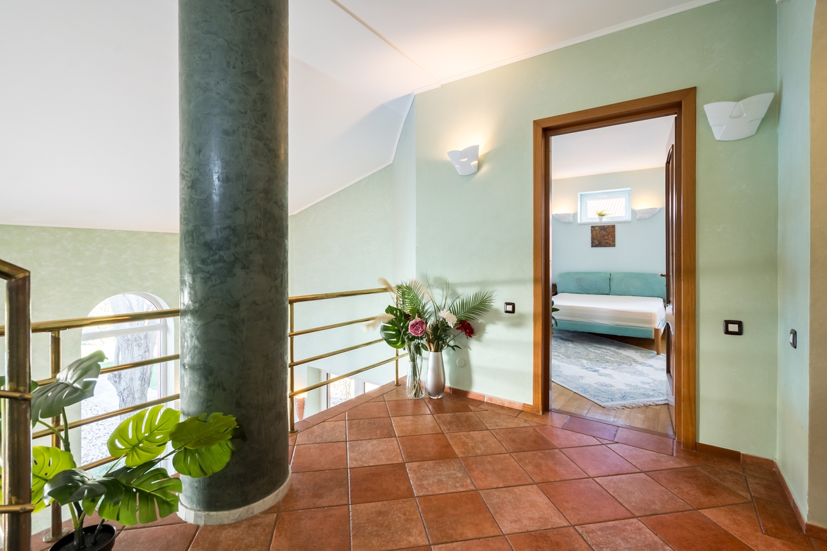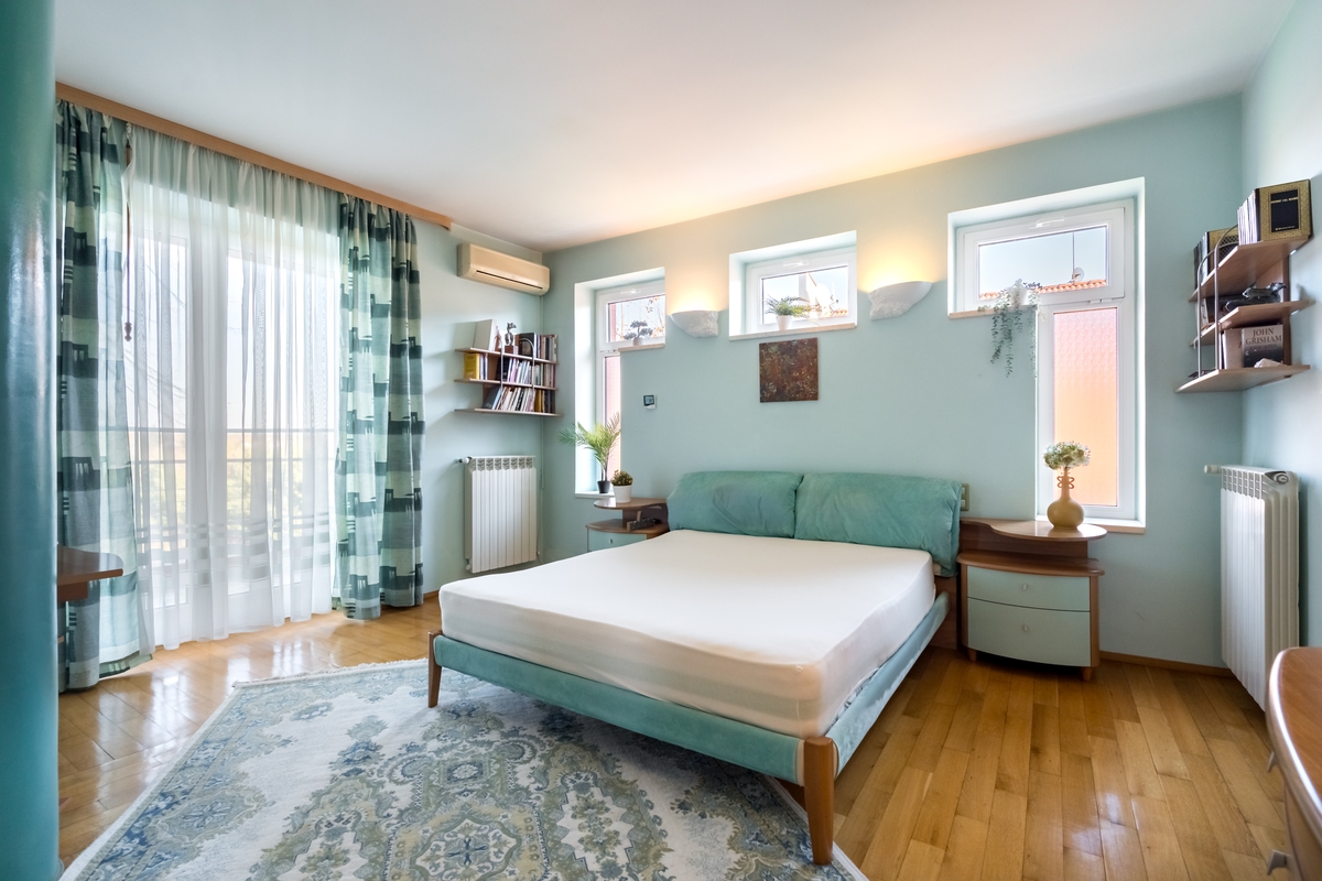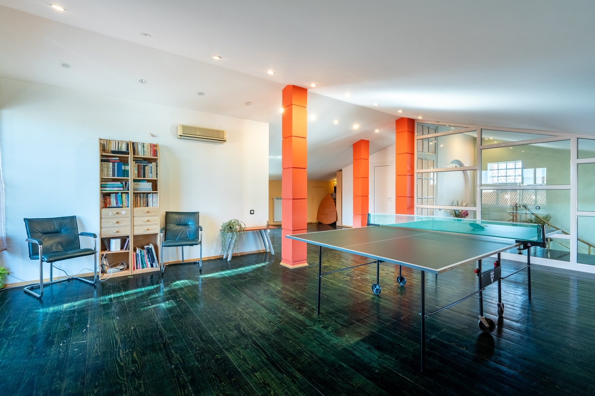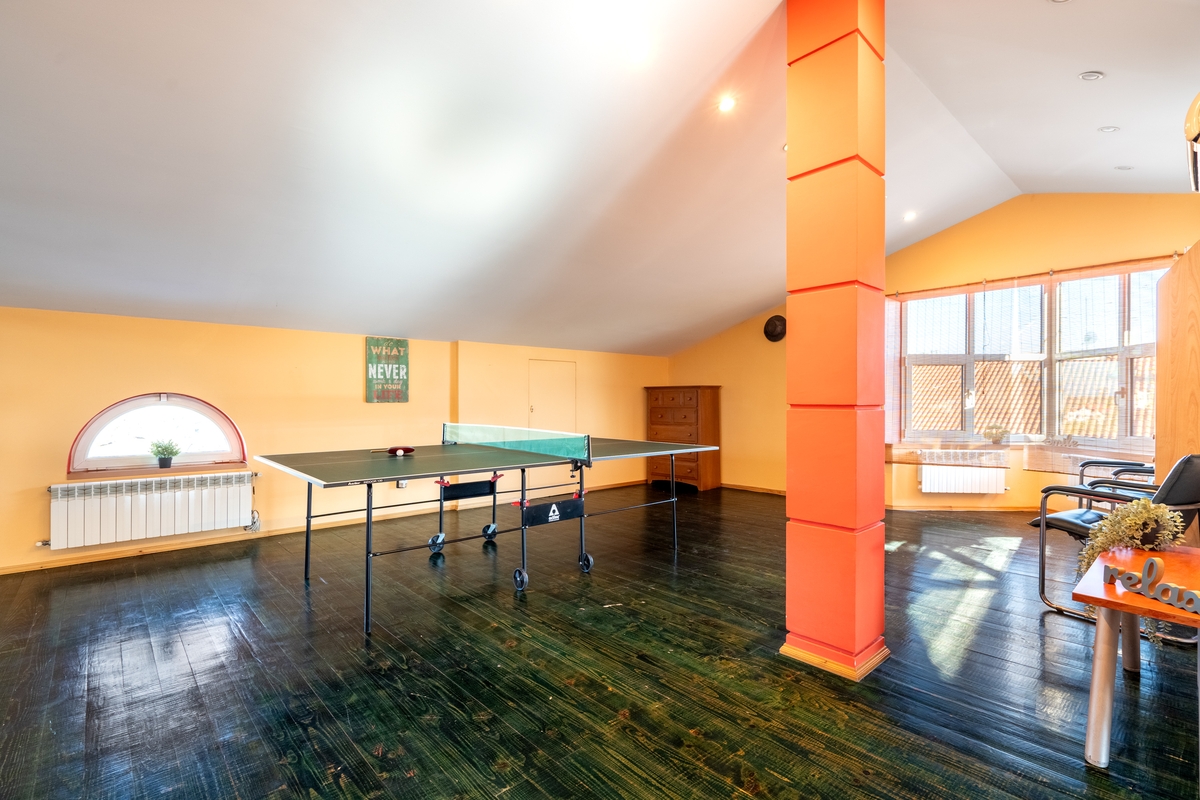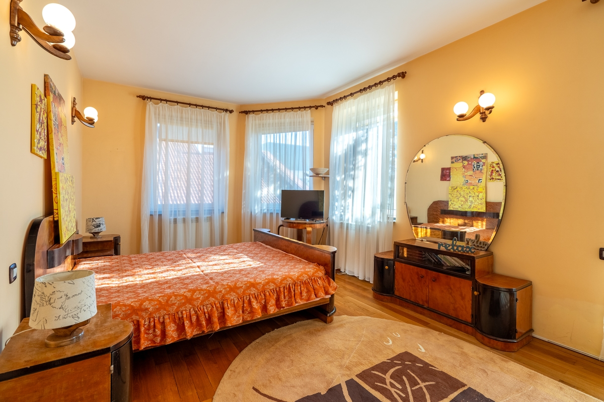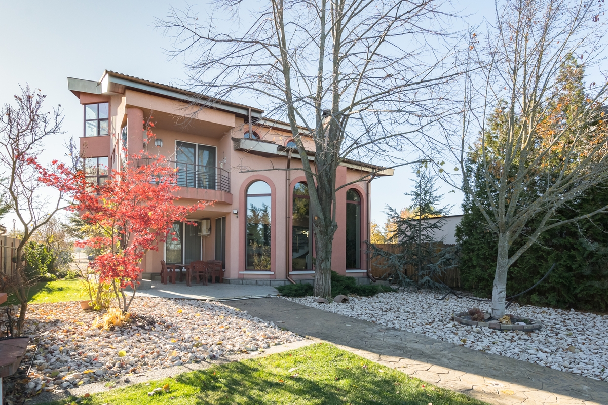 Casa dispune in prezent de 3 dormitoare, 4 bai, multiple terase/balcoane, o zona deschisa la ultimul etaj ce poate fi folosita ca spatiu de recreere sau care permite amenajarea altor 2 dormitoare, precum si o zona de living de 66mp, cu vedere superba catre curtea si piscina casei si catre lacul Snagov. Casa a fost construita in anul 2000, cu materiale de inalta calitate si elemente distincte de design, care ii confera in prezent eleganta si distinctie, desi finisajele nu au fost inca actualizate. Arhitectura casei permite invaluirea tuturor camerelor in foarte multa lumina naturala, precum si o priveliste panoramica superba catre lac din majoritatea incaperilor.