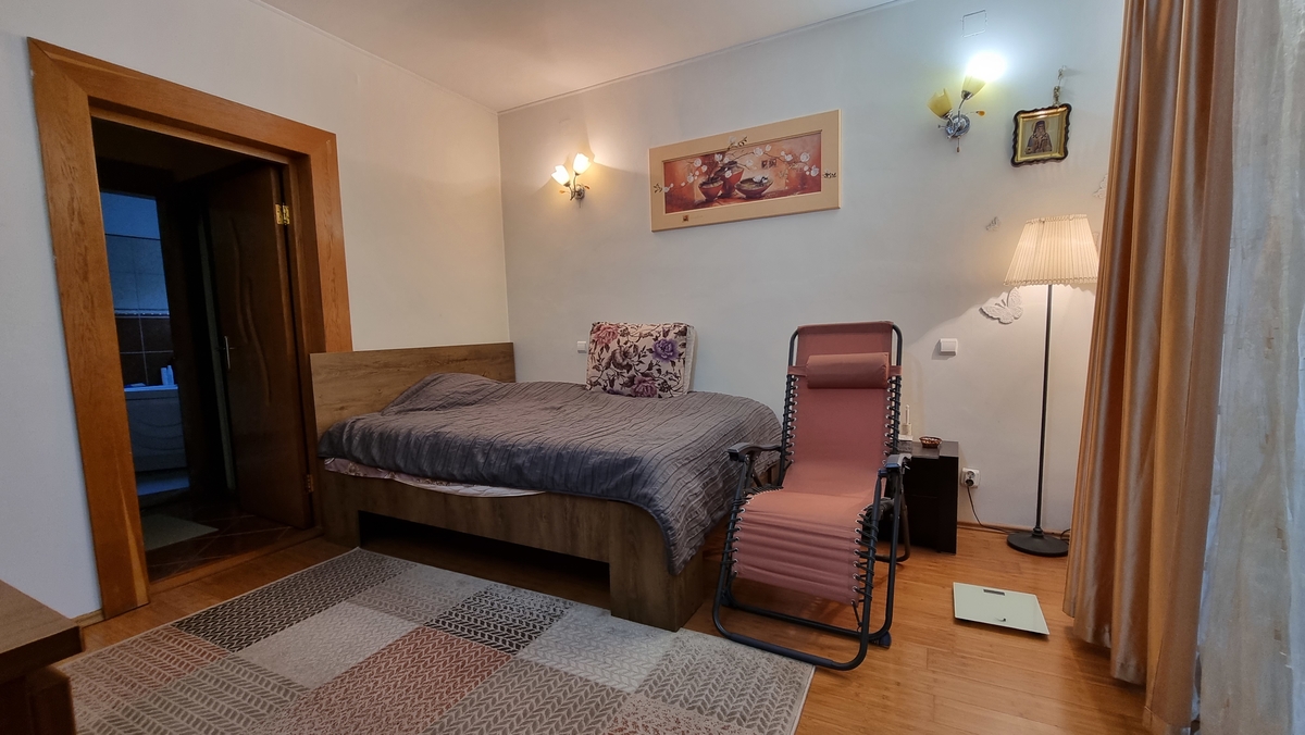 La etaj sunt 3 camere, cu acces din camera de zi fiecare, balcon (ce este transformat in spatiu de servire masa), doua bai si spatiu de depozitare.