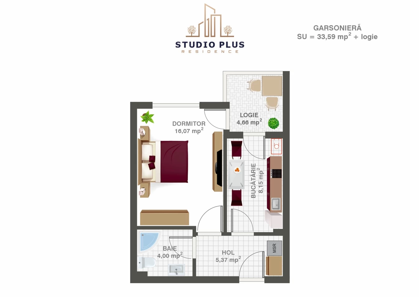 Garsoniera decomandata, cu o suprafata totala utila de 38.25 mp. Locuinta este disponibila la etajul 6 intr-un imobil nou, cu regim de inaltime Ds+P+6 etaje.