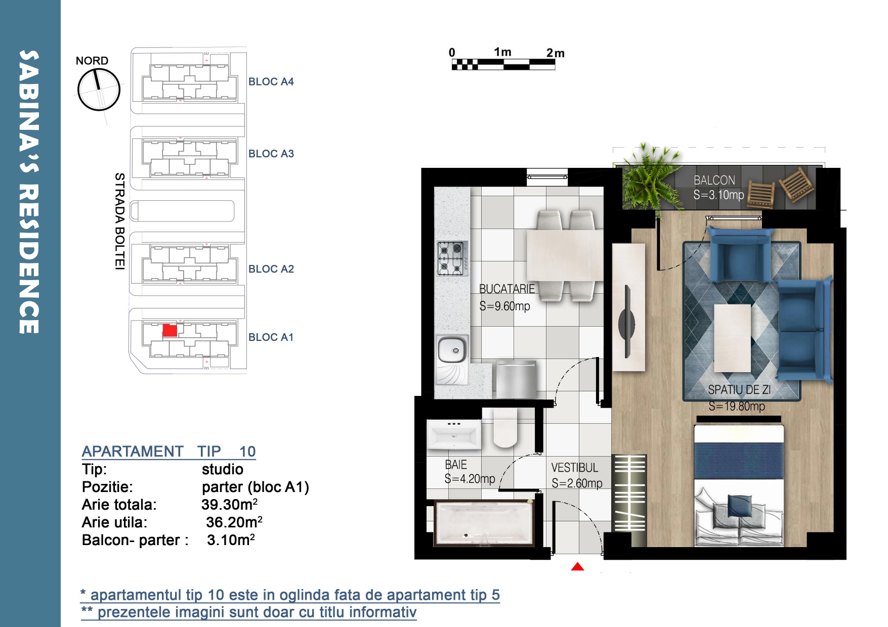 Locuinta dispune de o suprafata totala de 39.30 mp, cu balcon inclus de 3.10 mp si beneficiaza de o compartimentare decomandata, dupa cum urmeaza: camera de zi 19.80 mp cu trecere in balcon 3.10 mp, bucatarie inchisa 9.60 mp, hol acces 2.60 mp si baie 4.20 mp.