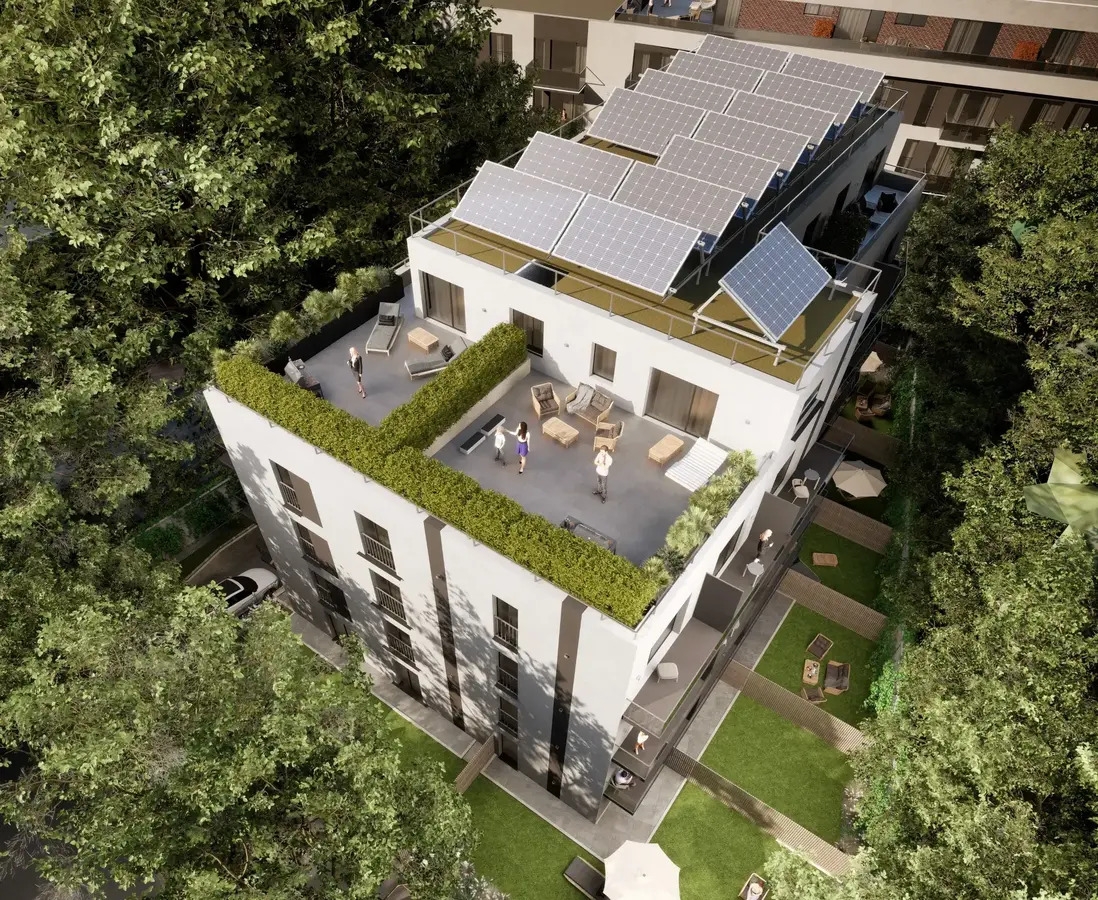 • Spatiile comune (iluminat, lift) beneficiaza de un consum electric provenit partial din panouri fotovoltaice montate pe terasa blocului, contribuind la reducerea costurilor si a amprentei de carbon;