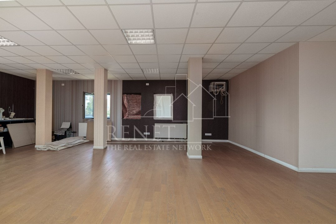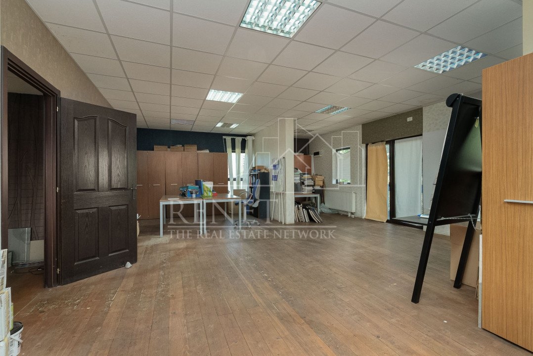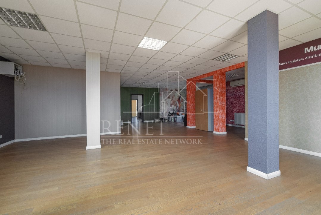 La etajul 1, partea de showroom, care dispune tot de o suprafata de 240mp, este finisata cu parchet din lemn masiv, pereti cu tapet si tavan casetat.