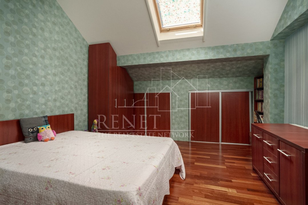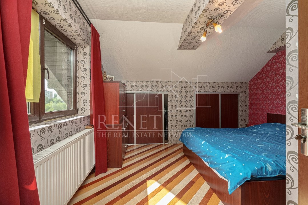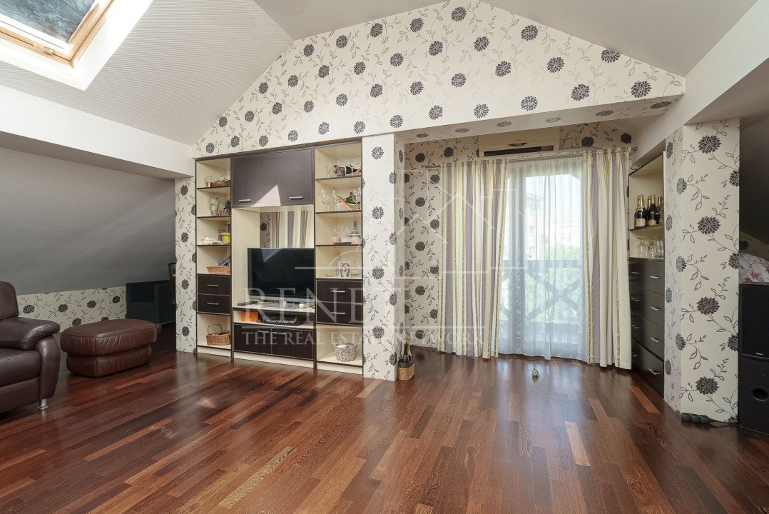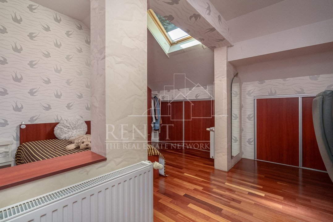 Iar la mansarda, regasim un apartament cu 4 camere, complet finisat, mobilat si utilat cu multiple spatii de depozitare si o suprafata totala de 190mp. Etajul 1 si Mnsarda beneficiaza de acces separat. Curtea din fata este pavata iar in cea din spate regasim o gradina cu vegetatie matura.