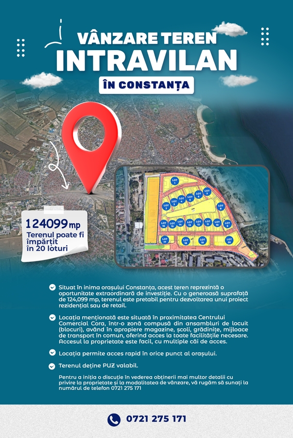 Situat in inima orasului Constanta, acest teren reprezinta o oportunitate extraordinara de investitie. Cu o generoasa suprafata de 124,099 mp, terenul este pretabil pentru dezvoltarea unui proiect rezidential sau de retail.