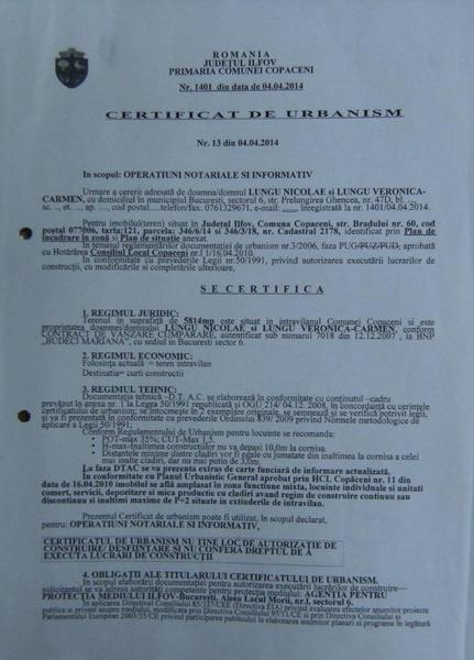 proprietar vand teren localitate copaceni judet Ilfov, intravilan, prin P.U.G. 5814 mp deschidere compacta 30m, dezmembrat in loturi 646 mp cu deschidere 22 m si drum acces 7.5m, teren dubla deschidere.