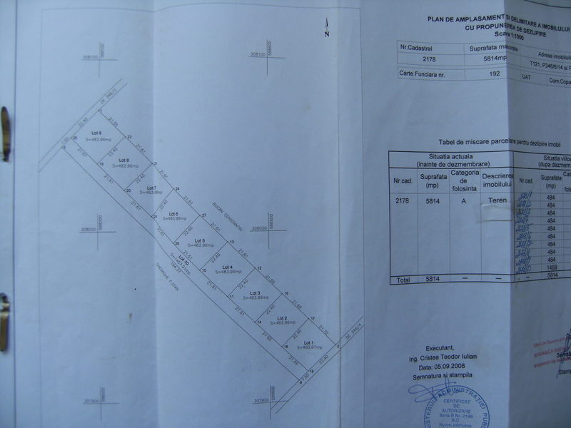 Proprietar Vand Teren zona 1Decembrie in Localitatea Copaceni Judetul Ilfov Intravilan prin P.U.G.5814mp deschidere compacta 30m lotizat-in loturi de 646mp cu deschidere pt.fiecare lot.22m cu drum de acces la loturi care este din propriul teren lat de 7.5m totodata acesta conexeaza doua planuri avand deschidere la ambele capete si drum.Conf.Cert.Urbanism este Destinatie Mixta atat pt.C-tii.civile dar si pt.Industriale fiind util pt.Case,vile dar si pt.Hale,depozite,ateliere de productie,samd.Utilitati la 200m la linia caselor.Certificat Urbanism.P.O.T.35% C.U.T.0,9h.max(la cornisa)10m.Cadastru si intabulare.Copaceni nu este Adunatii Copaceni,sunt localitati diferite cu judet diferit.Teren plat cu denumire de strada si numar postal pt.toate loturile,locatie in Str.Bradului nr.60.Accesul la teren se face pe asfalt prin Str.Nucului latime 12m ulterior drumul este pietruit pana la teren.Lot nr.2 si Lot nr.9 sunt date.Tel.0761329671,0725065443.