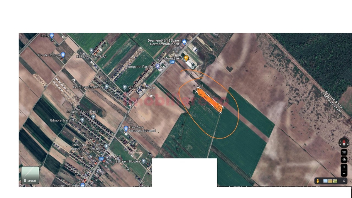 teren extravilan Sabareni, deschidere generoasa de 40 m la drum public. Gaze si curent in apropiere, la 400 m. Se poate trage foarte usor gaz si curent la teren. Terenul poate fi parcelat. Pret 3 euro/ mp