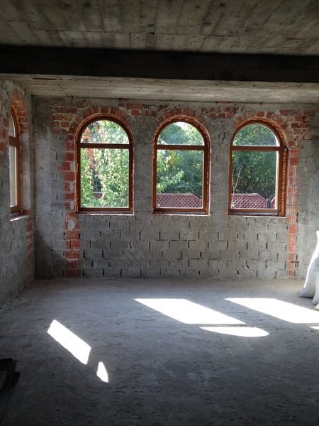 Are 3 dormitoare + living, 3 bai, dressinguri, o bucatarie de 20 mp si curte cu pamant vegetal fertil si pomi fructiferi.