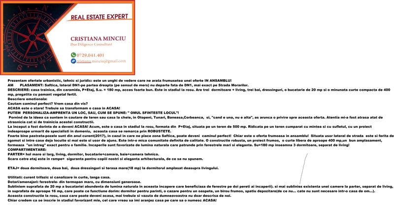 Pornind de la ideea ca suntem in cautare de teren sau casa la cheie, in Otopeni, Tunari, Baneasa,Corbeanca, si, "cand e una, nu e alta", sa studiem si aceasta oferta. DESCRIERE:casa trainica din caramida, P+Etaj, S.u.= 180 mp, amprenta 115 mp, teren total 500 mp, curte ibera= ~400 mp.In stadiul usor peste rosu, aflata intre alte doua case. Exista curent trifazic si canalizare in curte, receptie, intabulare, proprietar persoana fizica.